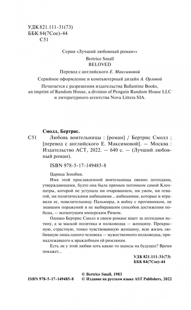 Однако Бертрис Смолл в своем романе ищет за легендами истину, а за маской политика и полководца — женщину. Прекрасную, страстную, тонко чувствовавшую женщину, всю жизнь любившую лишь одного человека — мужественного полководца, принадлежавшего к враждебным ей римлянам.