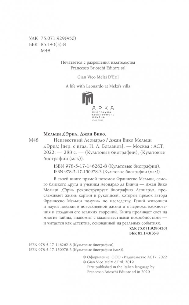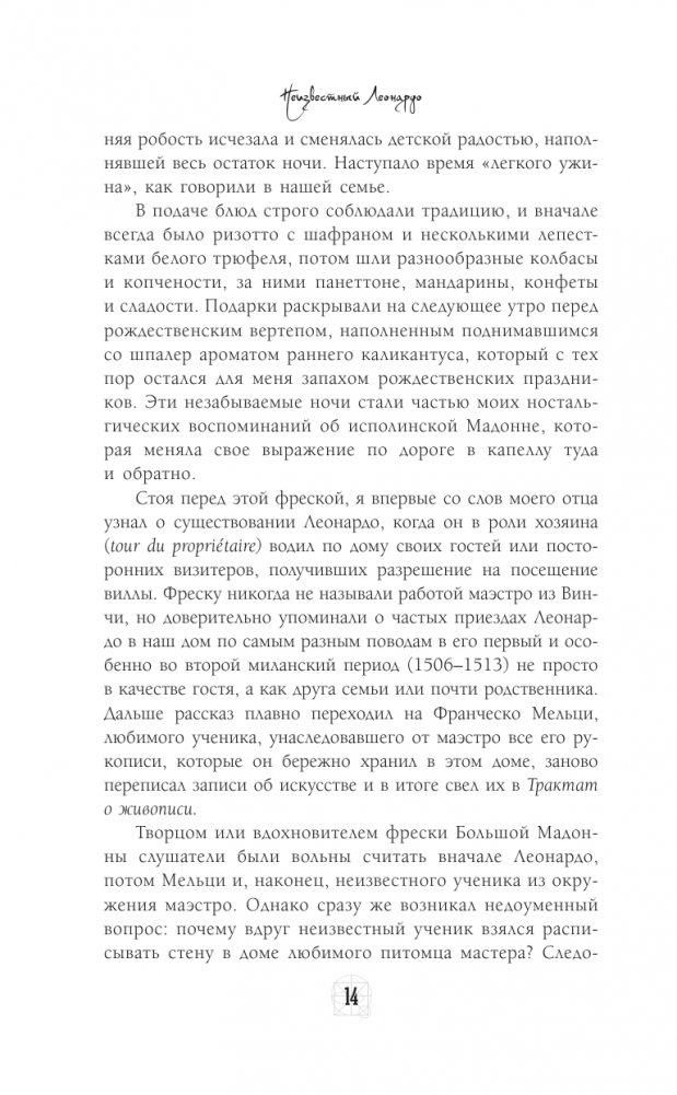 Великий Леонардо да Винчи никогда не был женат и не имел детей, но всегда окружал себя учениками, которые помогали ему в работе и вдохновляли на творчество. Франческо Мельци был, вероятно, последним большим увлечением Леонардо. Он познакомился с молодым человеком, тогда еще совсем ребенком, когда часто останавливался у его отца в имении Ваприо на берегу Адды, близ Милана. В возрасте пятнадцати лет Франческо Мельци, очарованный Леонардо, поступил к нему учеником. Между ними установились доверительные, более чем дружеские отношения, о чем свидетельствуют записи Леонардо. Свое время, жизнь и состояние Мельци всецело и навсегда предоставил в распоряжение Леонардо и на протяжении одиннадцати лет, вплоть до смертного часа Леонардо, он окружал его поистине сыновней любовью и заботой. После смерти своего наставника Мельци остался его наследником. Перед вами уникальная книга, ее автор Джан Вико Мельци д'Эрил, потомок Франческо Мельци, не только до сих пор живет на вилле, давшей приют великому художнику и его лучшему ученику, но и владеет уникальными, до сих пор не публиковавшимися свидетельствами, которые он решил предать огласке. Эта книга проливает свет на многие тайны, знакомит с малоизвестными подробностями – и читается как детектив, основанный на реальных событиях.