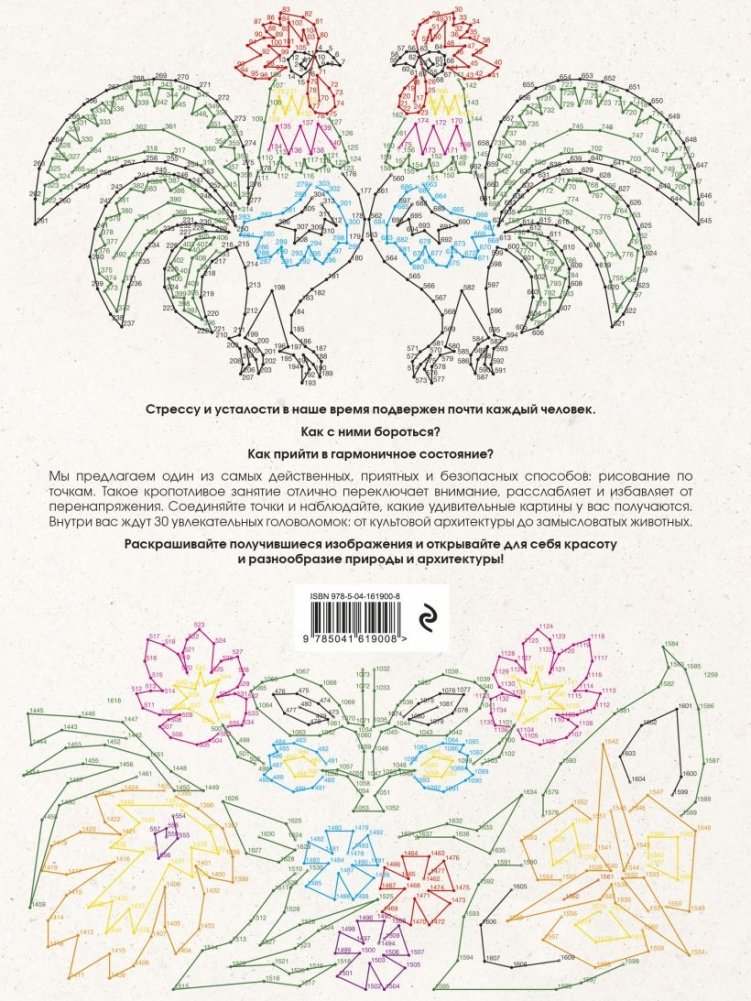 Подарите себе увлекательный вечер головоломок! Внутри этого издания вас ждут иллюстрации на разные темы: культовая архитектура, замысловатые орнаменты, благородные животные и необычные насекомые. Переключитесь от будничной суеты и наблюдайте, как волшебным образом, на листе начинают появляться львы, ящерицы, совы и многие другие. Для удобства, на всех иллюстрациях есть несколько цветов, чтобы не терять нужные точки и помочь оживить ваши будущие картины. Плотная бумага страничек раскраски позволит применять разные художественные инструменты: цветные карандаши, фломастеры, гелевые или шариковые ручки, краски, пастельные карандаши или восковые мелки.