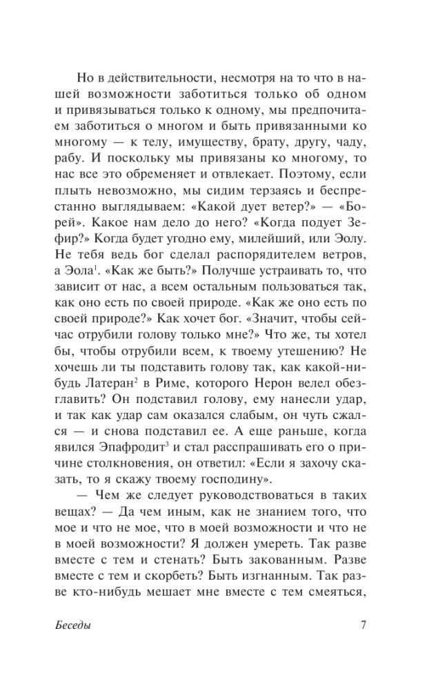 Эпиктет, по примеру Сократа, только вслух излагал свои мысли, поэтому "Беседы" дошли до нас в записи его ученика, впоследствии прославленного историка Арриана. Его философия проповедует человеколюбие и чистоту души, отстаивает равенство всех людей.