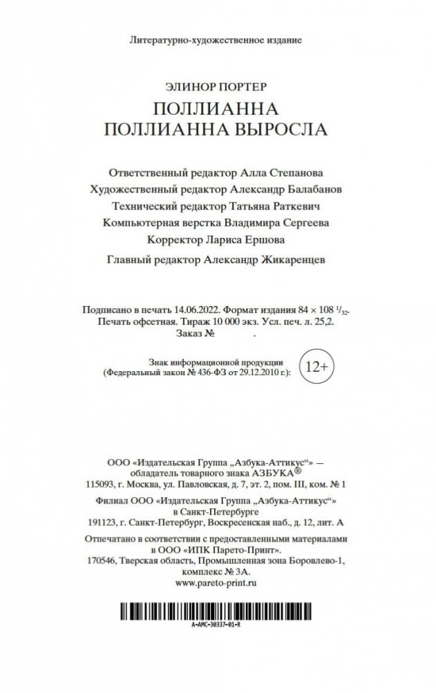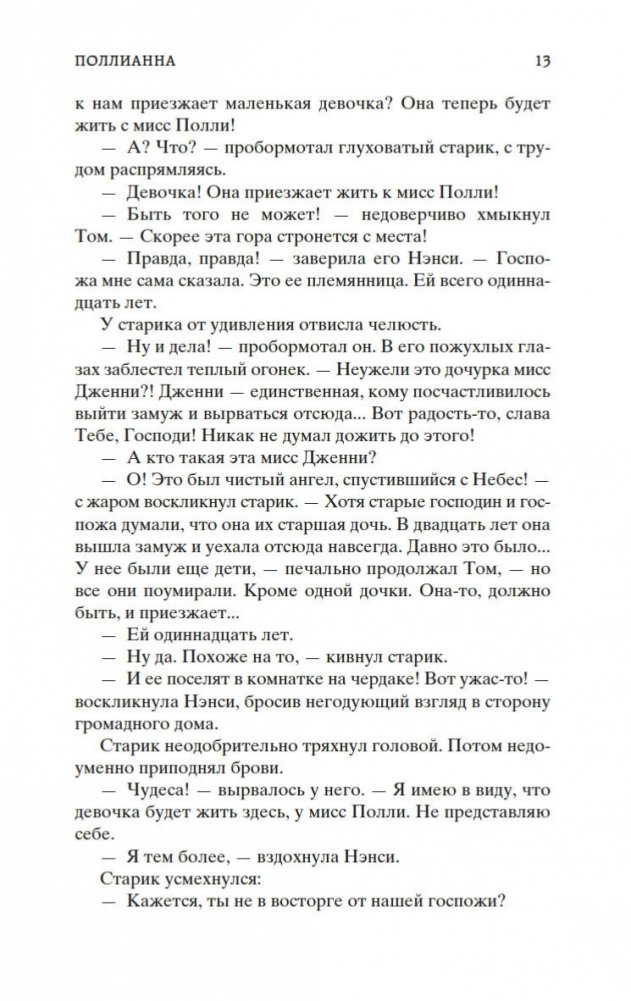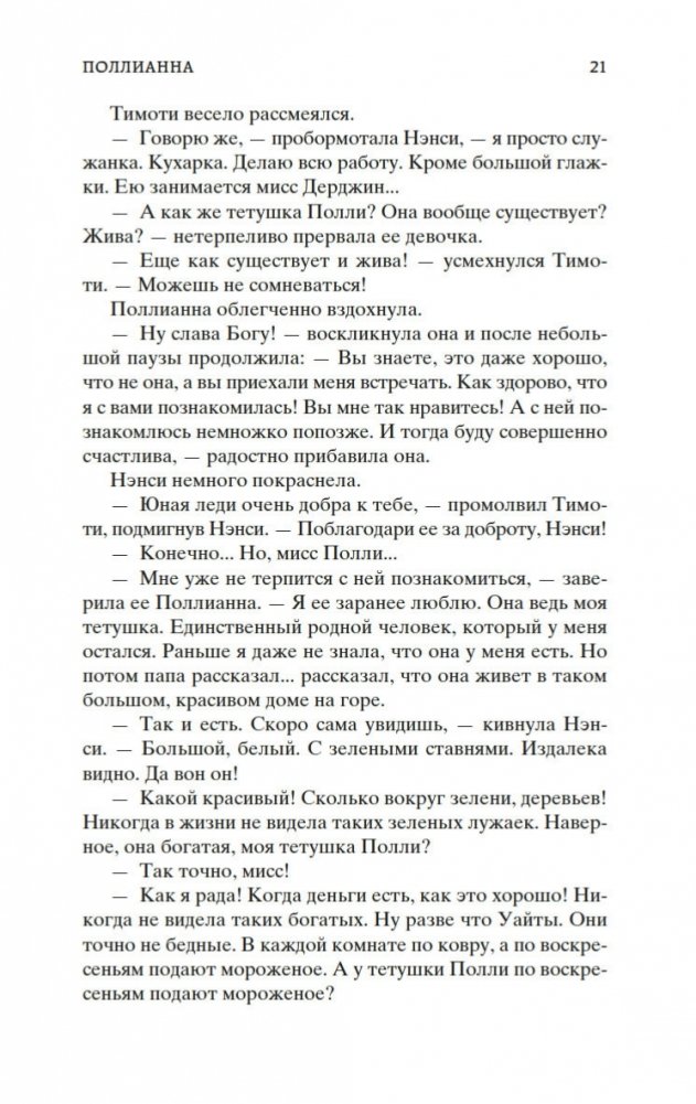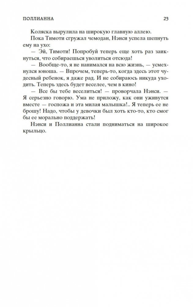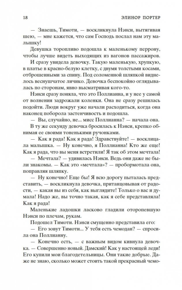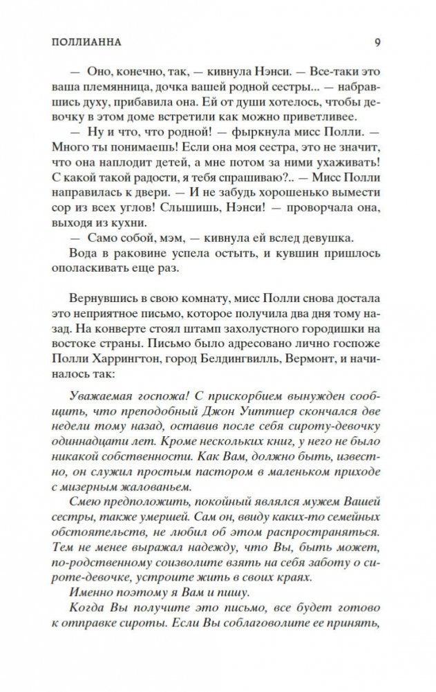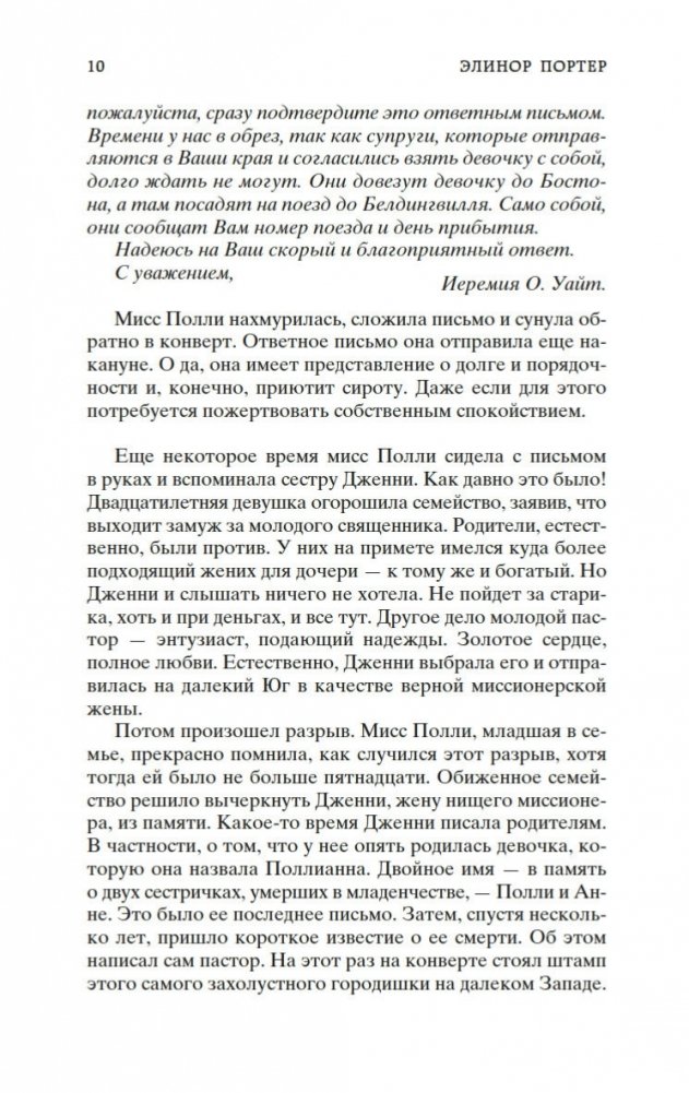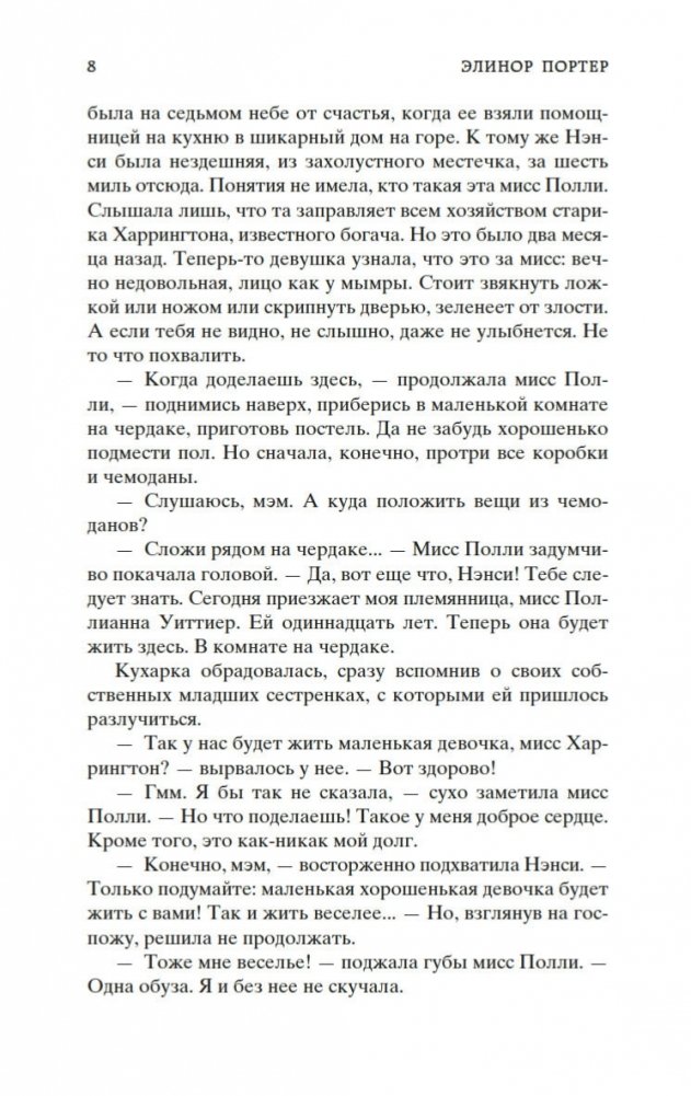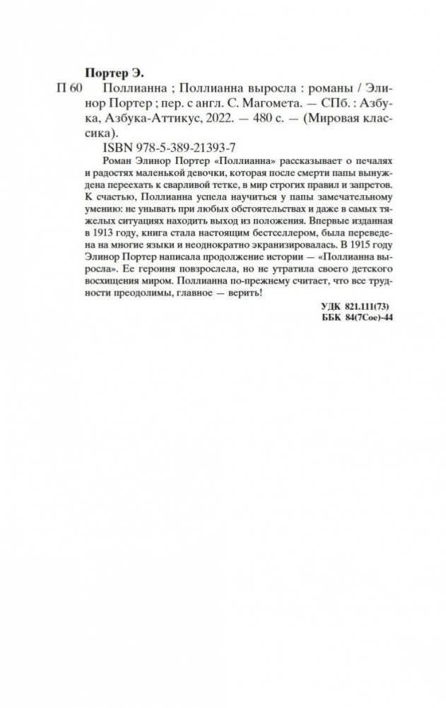 Роман Элинор Портер «Поллианна» рассказывает о печалях и радостях маленькой девочки, которая после смерти папы вынуждена переехать к сварливой тетке, в мир строгих правил и запретов. К счастью, Поллианна успела научиться у папы замечательному умению: не унывать при любых обстоятельствах и даже в самых тяжелых ситуациях находить выход из положения. Впервые изданная в 1913 году, книга стала настоящим бестселлером, была переведена на многие языки и неоднократно экранизировалась. В 1915 году Элинор Портер написала продолжение истории — «Поллианна выросла». Ее героиня повзрослела, но не утратила своего детского восхищения миром. Поллианна по-прежнему считает, что все трудности преодолимы, главное — верить!