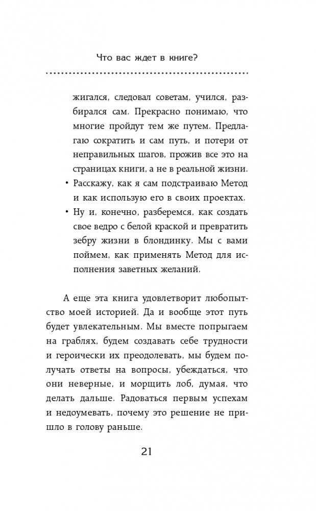 К этому вопросу существует немало подходов. Михаил Павлов исследовал многие из них и создал свой метод, который реально работает. В этой книге он делится собственным опытом и историей возникновения Метода тайной комнаты. Честно, откровенно, ненавязчиво. Чтобы желания исполнялись, вам не нужно верить в Высшие силы – достаточно верить в себя.
