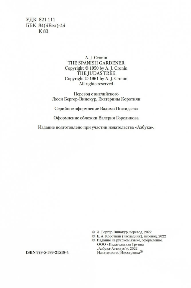 У консула Харрингтона Брэнда не сложились ни личная жизнь, ни карьера. Получив незначительный пост в маленьком испанском городке, он переезжает туда вместе с сыном Николасом. Эгоистичный и властный отец не разрешает мальчику видеться с матерью, под предлогом слабого здоровья не пускает его в школу и не позволяет общаться со сверстниками. И потому Николас быстро заводит дружбу с молодым дружелюбным садовником Хосе. Чувствуя, что сын выходит из-под его жесткого контроля, обозленный Харрингтон Брэнд идет на сомнительные меры, чтобы разорвать дружбу Николаса и Хосе… Дэвид Мори, шотландский врач, живет в Швейцарии и пользуется уважением в обществе. Его считают баловнем судьбы. Однако уже много лет Мори страдает бессонницей, его преследуют воспоминания о женщине, которую он когда-то любил, но бросил. Не в силах исправить ошибки молодости, он снова и снова разрушает себя, ломает судьбы дорогих ему женщин и приближает неминуемую трагедию… Романы «Испанский садовник» (впервые на русском!) и «Древо Иуды» написаны в прекрасной повествовательной манере классических произведений Кронина.