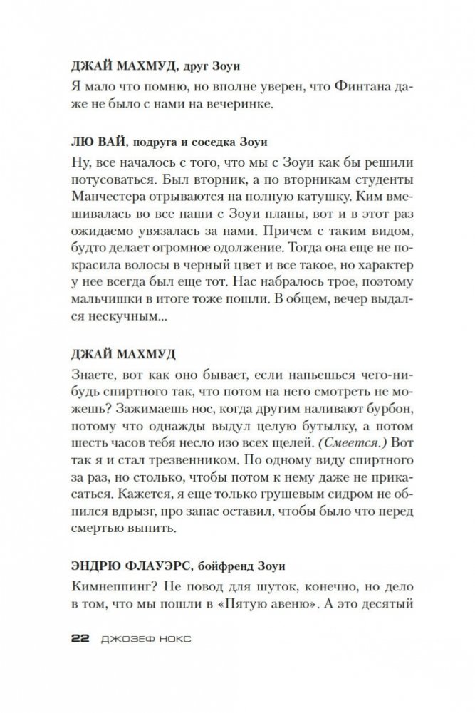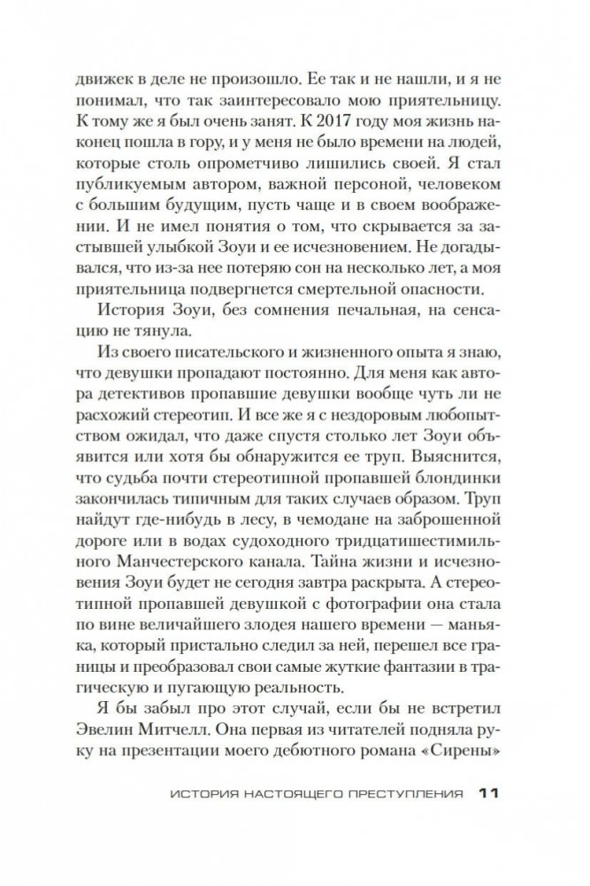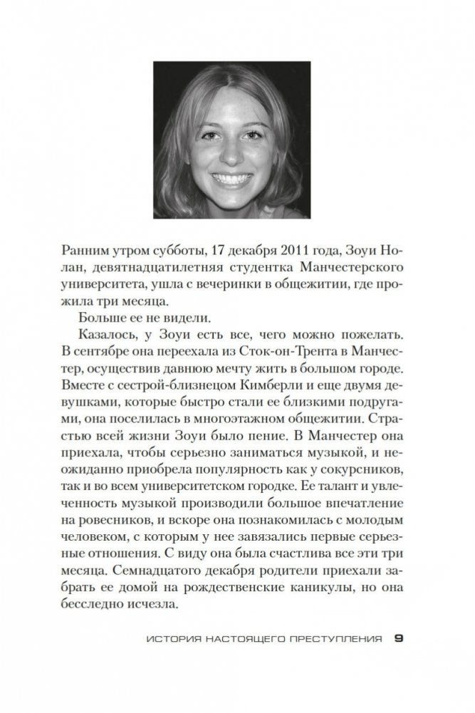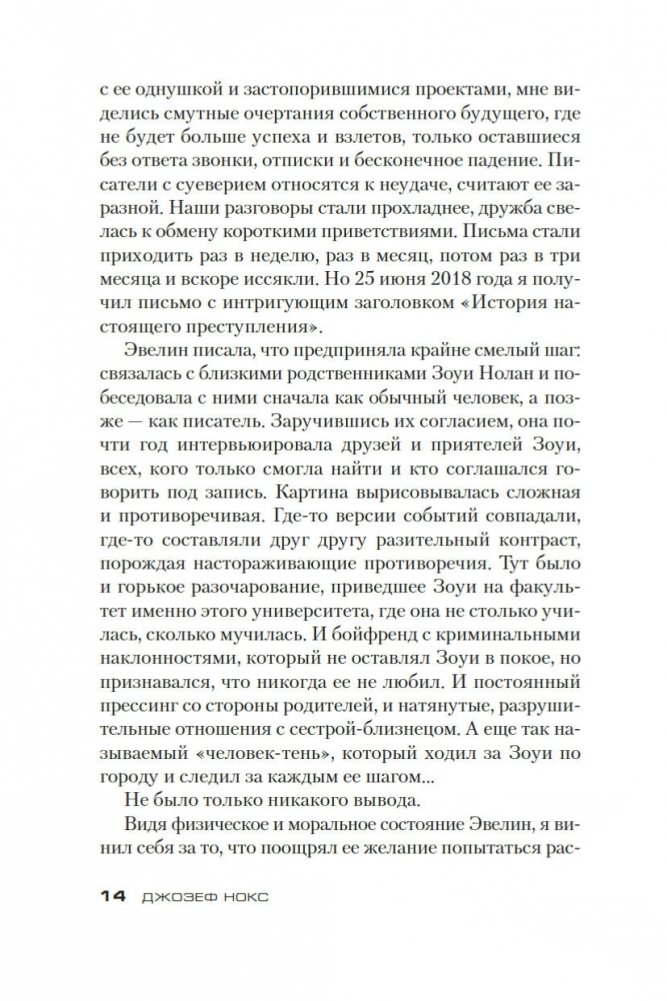 «Что происходит с пропавшими девушками? С такими, как Зоуи Нолан?» Ночью 17 декабря 2011 года девятнадцатилетняя студентка Манчестерского университета Зоуи Нолан вышла с вечеринки в общежитии — и пропала. Длительные полицейские поиски не дали никаких результатов. Через семь лет писательница Эвелин Митчелл решает провести свое расследование и заново опрашивает друзей и родственников Зоуи. В чем-то их истории сходятся, в чем-то — противоречат друг другу, рисуя тревожную картину тайной жизни пропавшей девушки. Всем фигурантам дела есть что скрывать, а кто-то неотступно следит за Эвелин из теней — и она обращается за помощью к «главной надежде британского криминального романа» (по утверждению газеты «Таймс») Джозефу Ноксу, автору прославленной трилогии об Эйдане Уэйтсе («Сирены», «Улыбающийся человек», «Блуждающий в темноте»)… Впервые на русском!