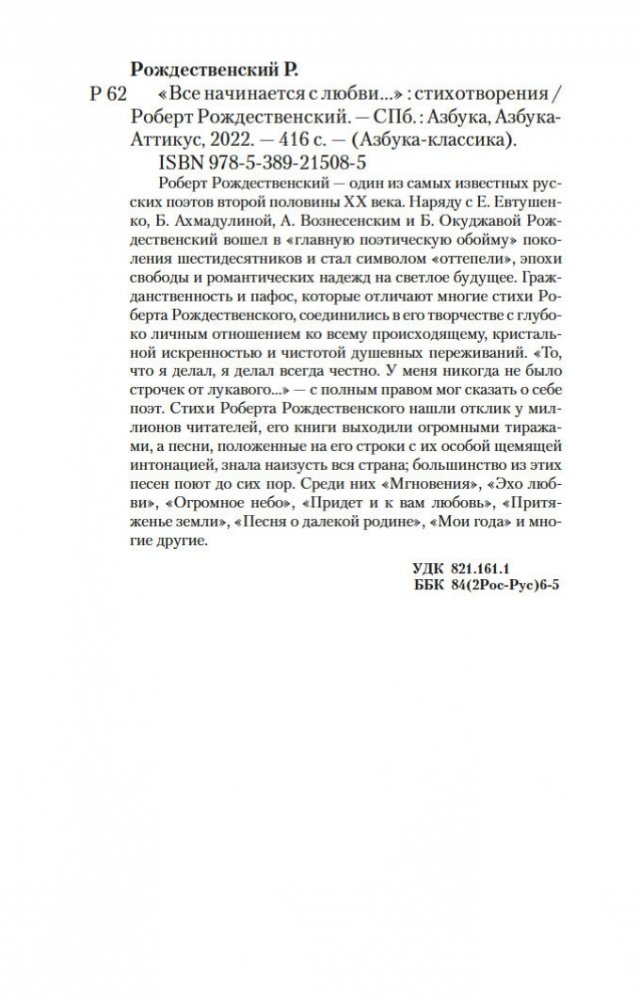Роберт Рождественский — один из самых известных русских поэтов второй половины ХХ века. Наряду с Е. Евтушенко, Б. Ахмадулиной, А. Вознесенским и Б. Окуджавой Рождественский вошел в «главную поэтическую обойму» поколения шестидесятников и стал символом «оттепели», эпохи свободы и романтических надежд на светлое будущее. Гражданственность и пафос, которые отличают многие стихи Роберта Рождественского, соединились в его творчестве с глубоко личным отношением ко всему происходящему, кристальной искренностью и чистотой душевных переживаний. «То, что я делал, я делал всегда честно. У меня никогда не было строчек от лукавого…» — с полным правом мог сказать о себе поэт. Стихи Роберта Рождественского нашли отклик у миллионов читателей, его книги выходили огромными тиражами, а песни, положенные на его строки с их особой щемящей интонацией, знала наизусть вся страна; большинство из этих песен поют до сих пор. Среди них «Мгновения», «Эхо любви», «Огромное небо», «Придет и к вам любовь», «Притяженье земли», «Песня о далекой родине», «Мои года» и многие другие.