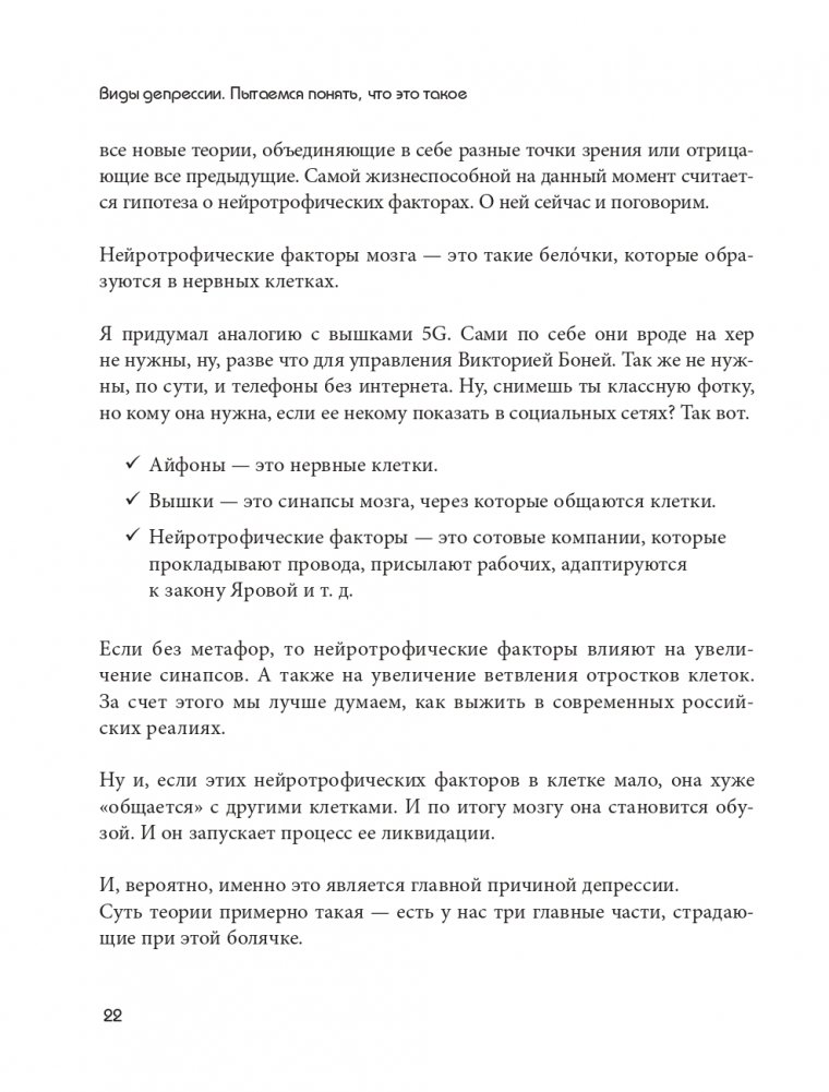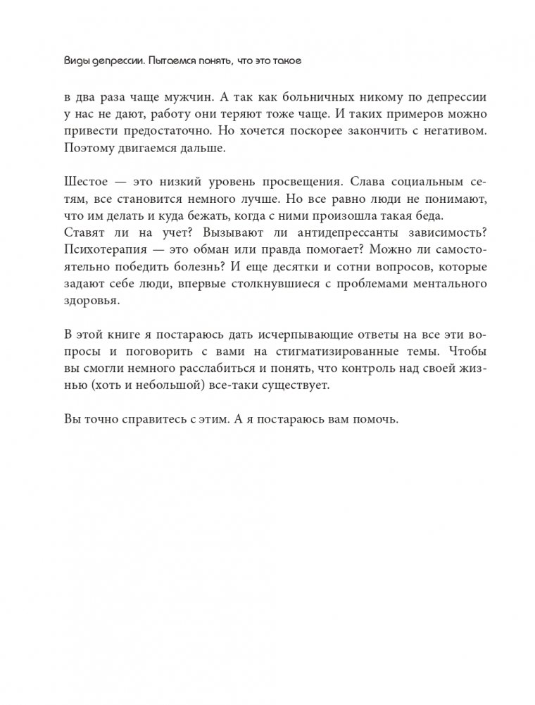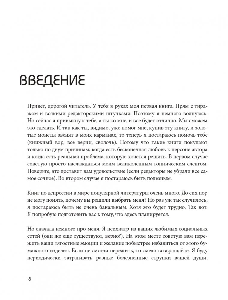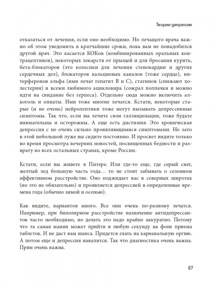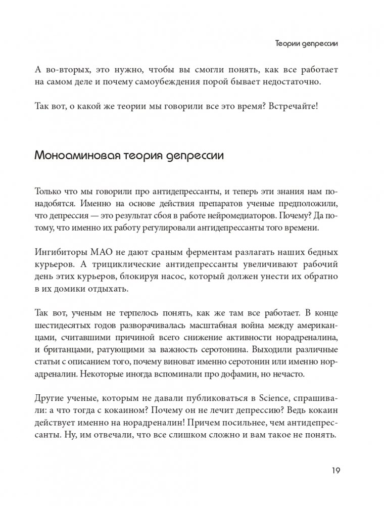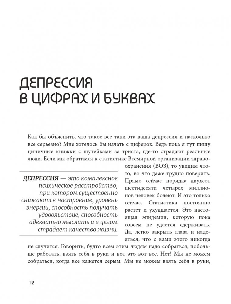 Наша психика делает все, что в её силах, чтобы помочь нам, но время от времени она дает настоящий сбой — подводит в самые неподходящие моменты, делает нас инертными и страдающими. Ваш мозг знает, что делать такие вещи нехорошо, но иногда он не может помочь, особенно если он попал в ловушку депрессии. Вот где на помощь приходит наша книга, настоящее руководство по выходу из психических расстройств.