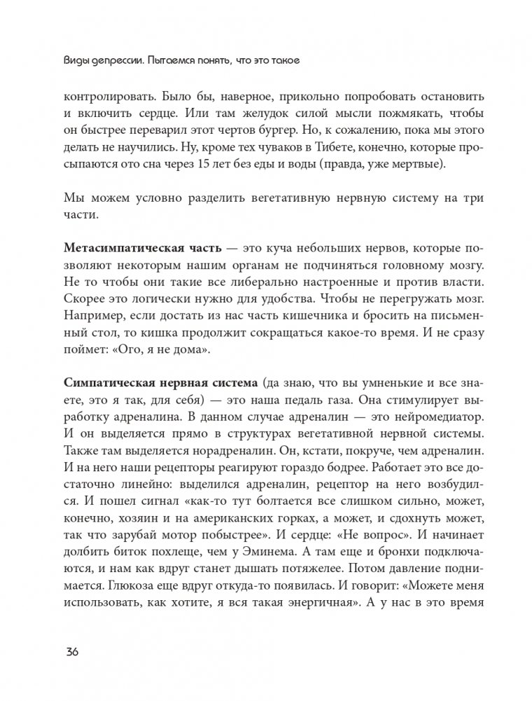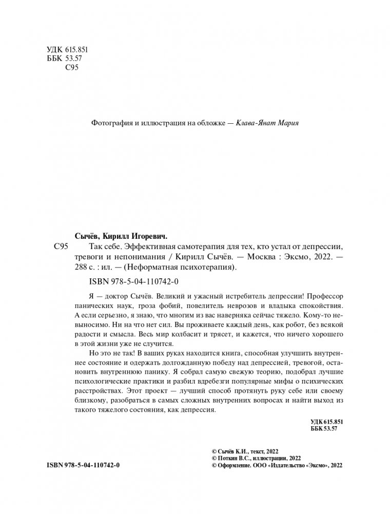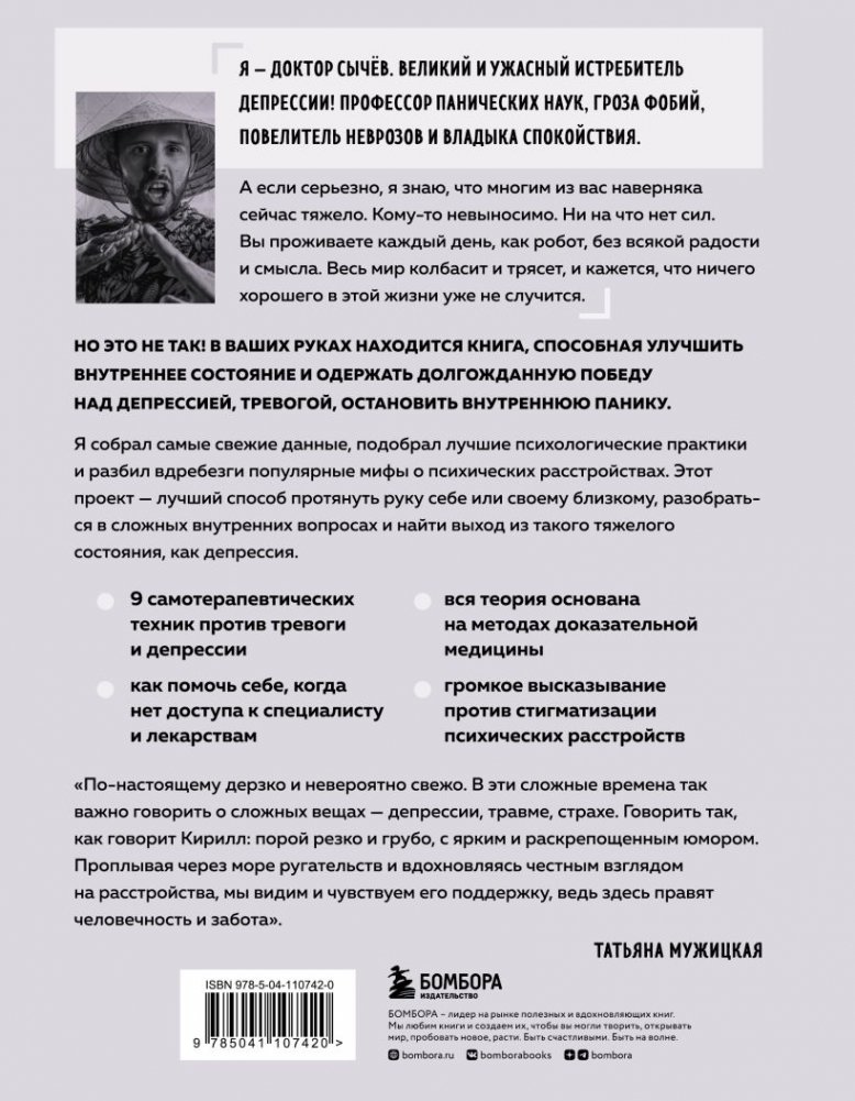 С юмором, наукой и любовью доктор Сычев объясняет, что происходит в вашем черепе. Настоящий магистр психотерапии говорит о сложных вещах, не стесняясь в выражениях и срывая маски стигматизации. Он рассказывает вам о процессе переучивания вашего мозга, чтобы вы больше не испытывали тревогу, депрессию, невроз и панику. Благодаря техникам, которые можно применить самостоятельно, вы сможете победить травму и не пустите переживания в свое сердце. Кирилл Сычев возьмет вас в путешествие по депрессии и сделает так, чтобы вы прониклись медициной как панк-культурой — культурой, которая идет в противовес болезням.