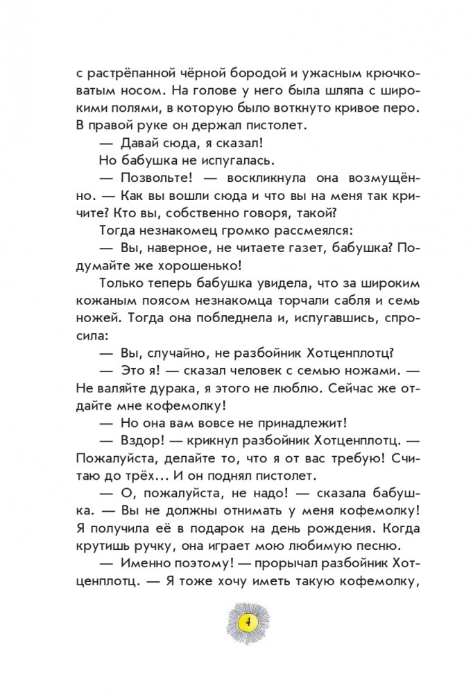 Однажды в один солнечный денёк происходит неожиданное происшествие. Похищена кофемолка, а бабушка Касперля найдена лежащей без сознания. Придя в себя, бабушка рассказывает невероятную новость: кражу совершил не кто иной, как знаменитый на всю округу неуловимый и хитрый разбойник Хотценплотц! Полиция в панике, и судьба бабушкиной кофемолки находится в руках неутомимых выдумщиков и искателей приключений Касперля и его верного друга Сеппеля. Вот теперь держись, Хотценплотц!