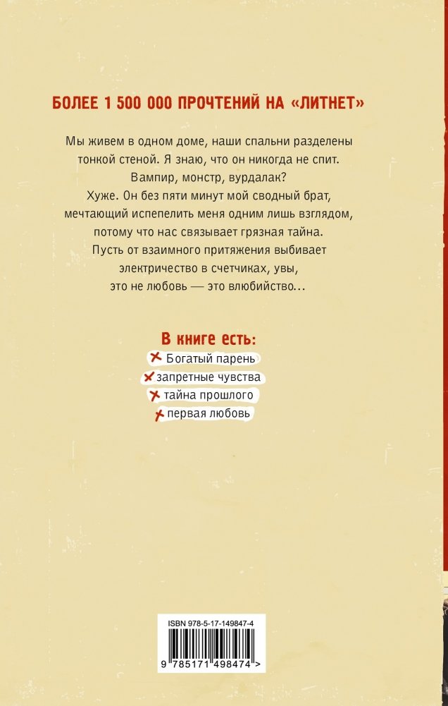 Мы живем в одном доме, наши спальни разделены тонкой стеной. Я знаю, что он никогда не спит. Вампир, монстр, вурдалак? Хуже. Он без пяти минут мой сводный брат, мечтающий испепелить меня одним лишь взглядом, потому что нас связывает грязная тайна. Пусть от взаимного притяжения выбивает электричество в счетчиках, увы, это не любовь — это влюбийство…