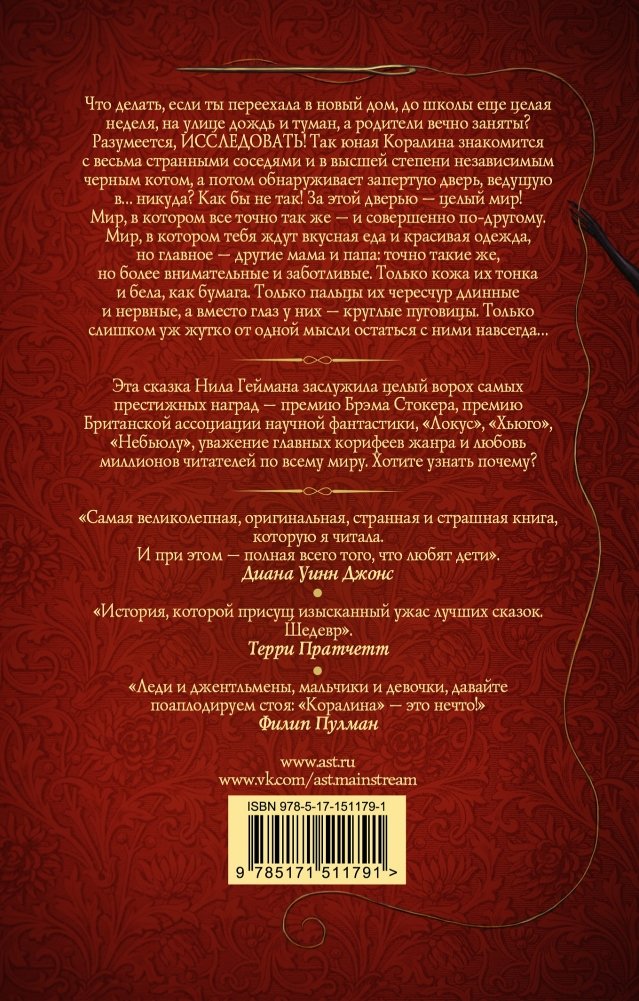 Что делать, если ты переехала в новый дом, до школы еще целая неделя, на улице дождь и туман, а родители вечно заняты? Разумеется, ИССЛЕДОВАТЬ! Так юная Коралина знакомится с весьма странными соседями и в высшей степени независимым черным котом, а потом обнаруживает запертую дверь, ведущую в… никуда? Как бы не так! За этой дверью — целый мир! Мир, в котором все точно так же — и совершенно по-другому. Мир, в котором тебя ждут вкусная еда и красивая одежда, но главное — другие мама и папа: точно такие же, но более внимательные и заботливые. Только кожа их тонка и бела, как бумага. Только пальцы их чересчур длинные и нервные, а вместо глаз у них — круглые пуговицы. Только слишком уж жутко от одной мысли остаться с ними навсегда…