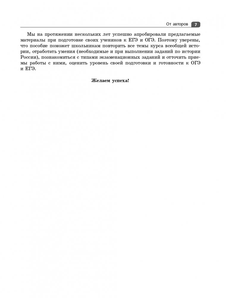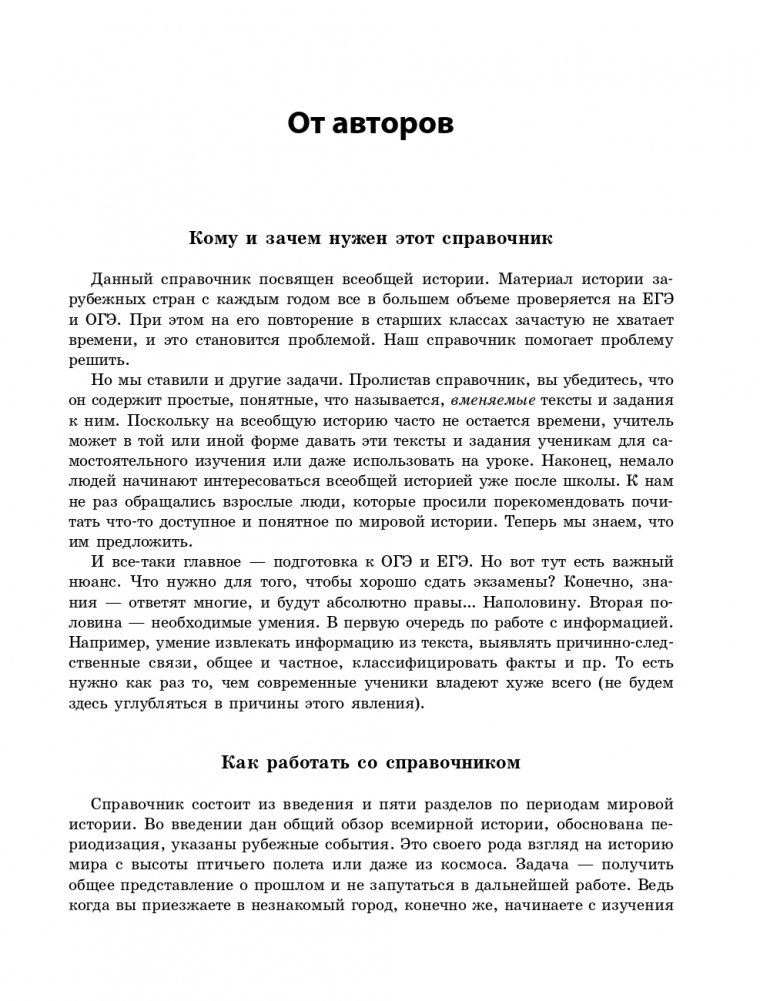 Книга содержит весь школьный курс всеобщей истории с 5-го по 11-й класс. Каждый параграф начинается с таблицы, в которой систематизированы основные события и процессы изучаемого исторического периода. Главы разбиты на задания по работе с текстами, сложность которых возрастает с каждой последующей темой. После разделов приводятся задания в формате ОГЭ и ЕГЭ с ответами. Подобная система изложения материала помогает учащимся научиться извлекать информацию из текста, классифицировать факты, устанавливать причинно-следственные связи, а также знакомит с типами экзаменационных заданий и совершенствует навыки их выполнения.