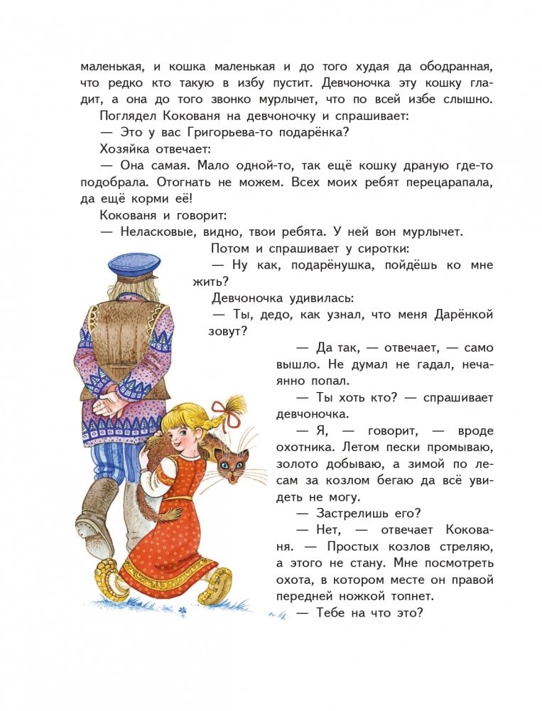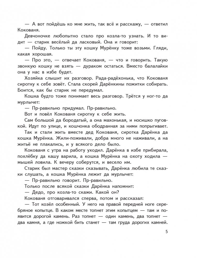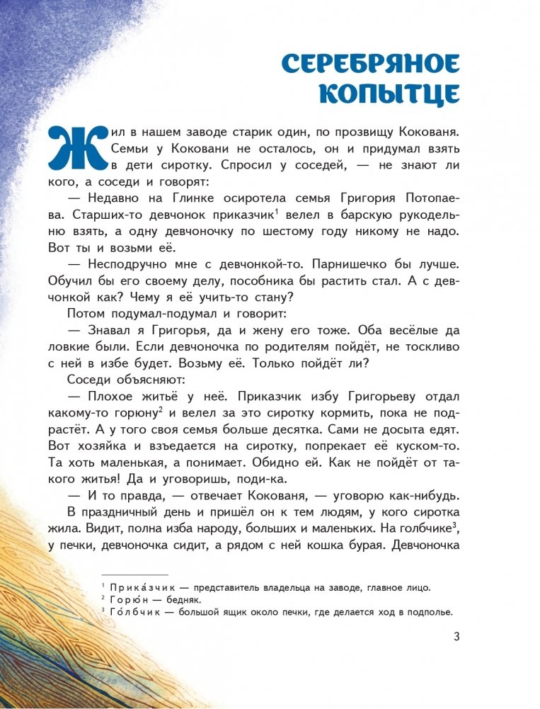 В книге П. Бажова «Серебряное копытце» собраны самые «детские» сказы писателя. Главные герои в них — обычные ребятишки: добрые, открытые, трудолюбивые и любознательные. Наверное, поэтому им помогают сказочные существа: козлик с серебряным копытцем, загадочная голубая змейка, могучий Великий Полоз и забавная Огневушка. И не просто помогают, а напоминают: только тот, кто сохранил в себе лучшие черты детства, поймёт подлинную красоту мира и обретёт настоящее счастье.