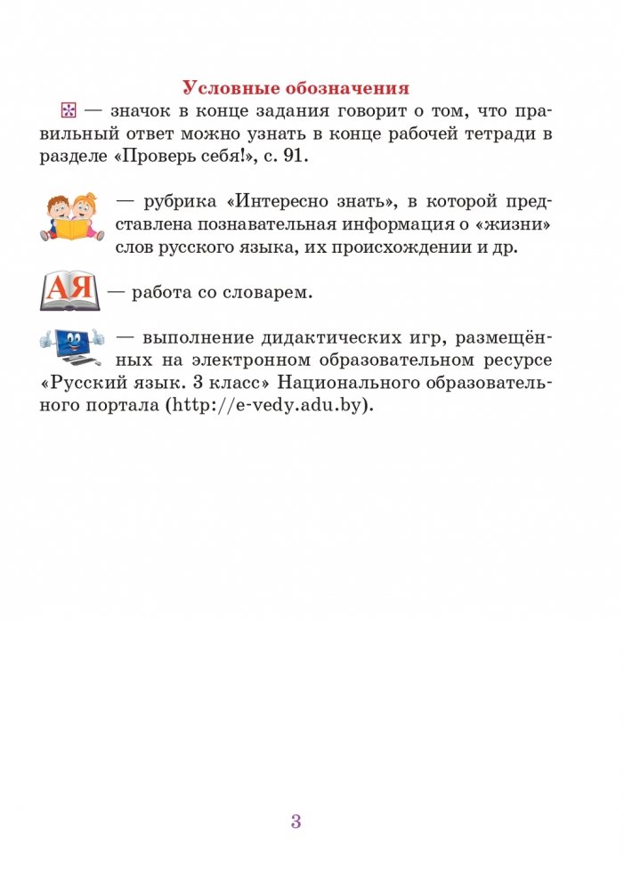 Данная рабочая тетрадь является частью учебно-методического комплекса для факультативных занятий по русскому языку в 3-м классе учреждений общего среднего образования с белорусским и русским языками обучения, в состав которого входит учебная программа для факультативных занятий "Язык родной, дружи со мной..." (раздел "В мире слов"), а также пособие для учителей начальных классов учреждений общего среднего образования с белорусским и русским языками обучения.