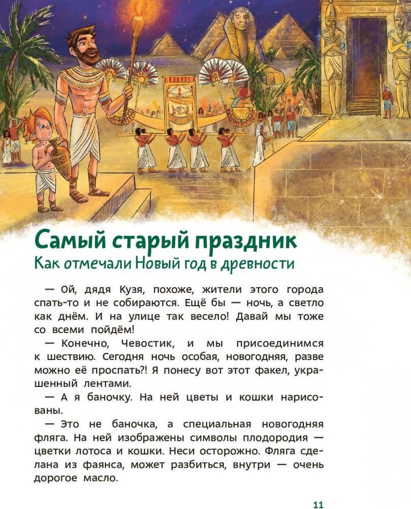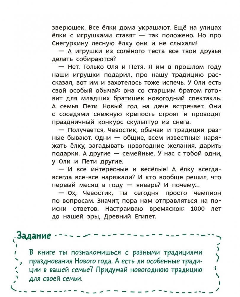 В новой книге серии детских энциклопедий Чевостик и Дядя Кузя увидят, как встречали Новый год в древности, и побывают на шумных празднествах в эпоху Петра I. Они посетят вторую всесоюзную ёлку в доме Советов, заглянут на современные торжества по всему миру от Китая до Австралии и познакомятся с зимними волшебниками, приносящими подарки детям: Кыш Бабаем, Шурале, старцем Ямалом Ири и весёлым морозецем Паккайне. А еще узнают, что Новый год празднуют не только зимой, но весной, осенью и... даже летом!