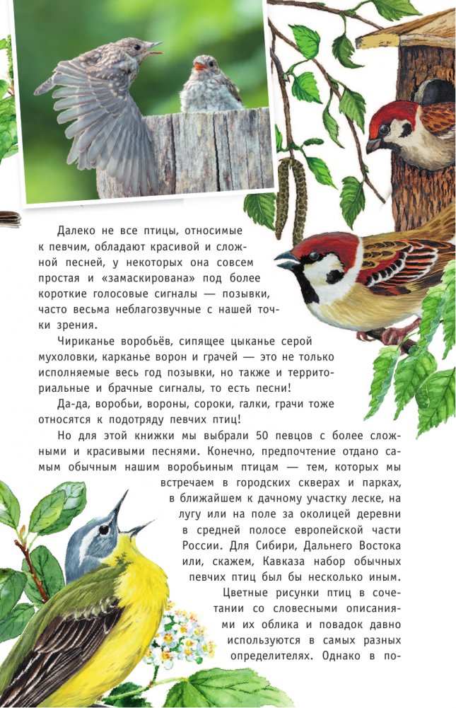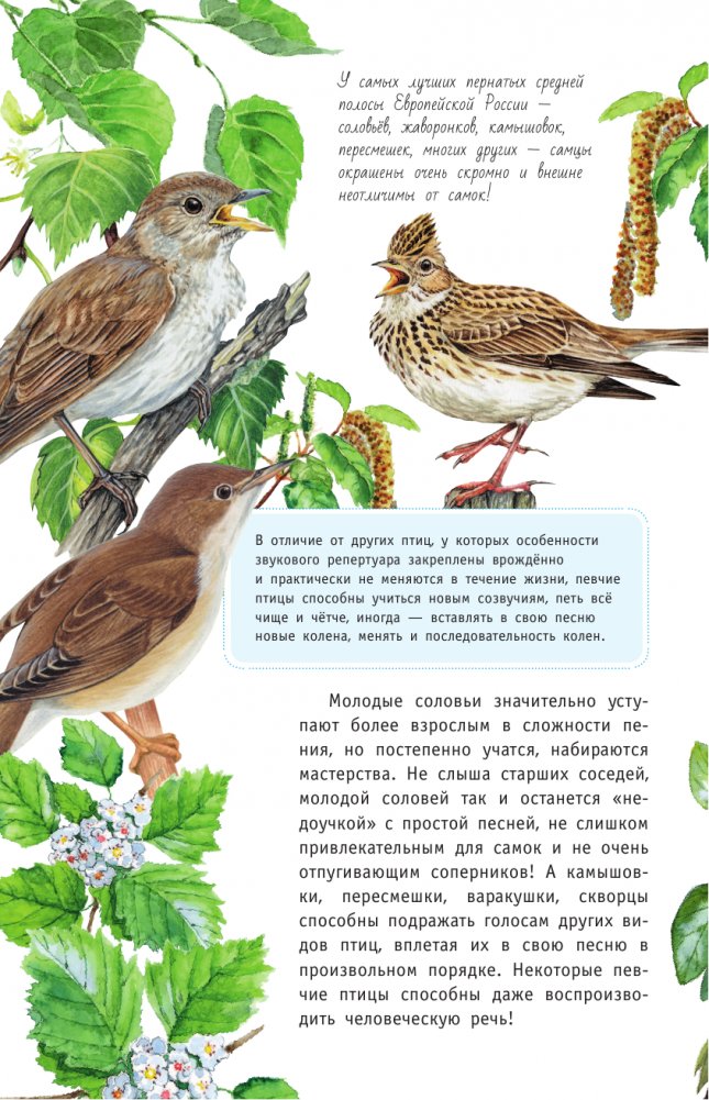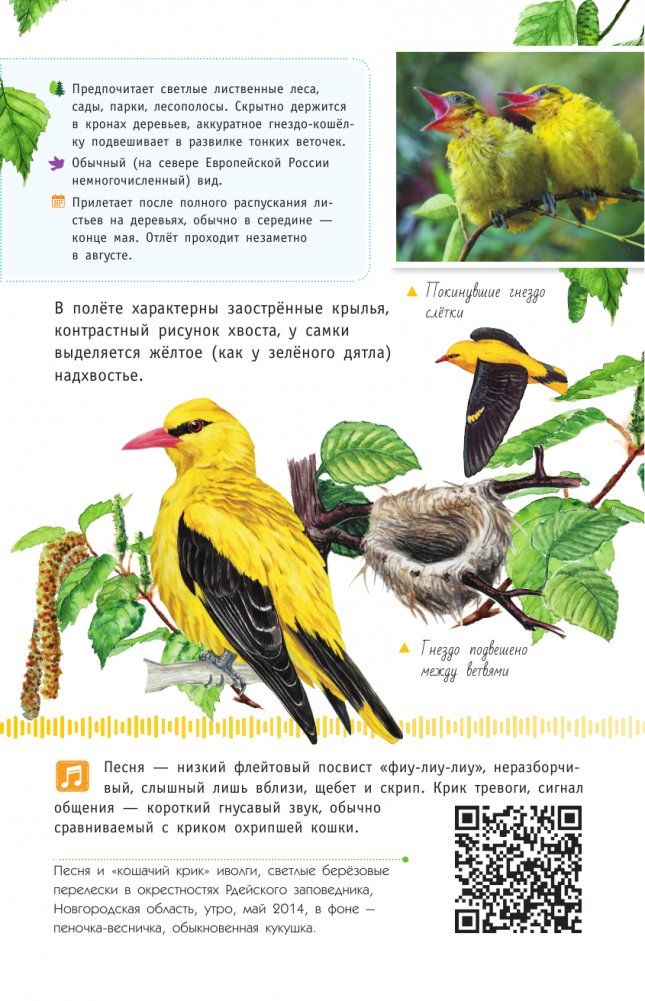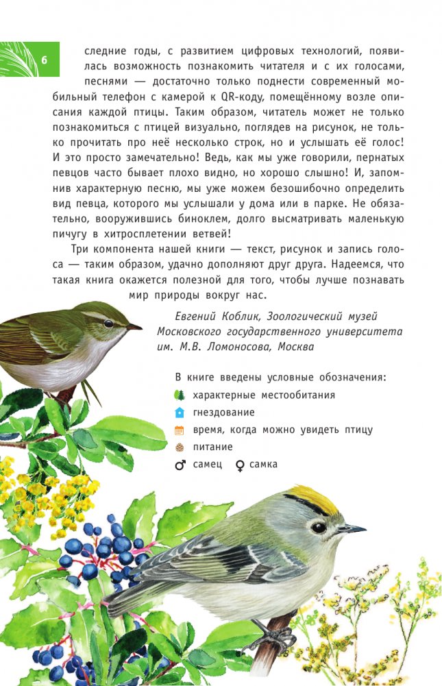 Определитель "Певчие птицы средней полосы европейской части России с голосами птиц", написанный орнитологами Евгением Кобликом и Владимиром Архиповым, поможет юным и взрослым любителям природы научиться определять птиц в природе, расскажет, по каким признакам можно отличать птиц в полёте, самцов, самок и молодых птиц одного вида, представит примеры их облика на анималистических рисунках и фотографиях. Описания песен и звуков дополнят QR-коды, с помощью которых можно услышать "живые" голоса птиц.