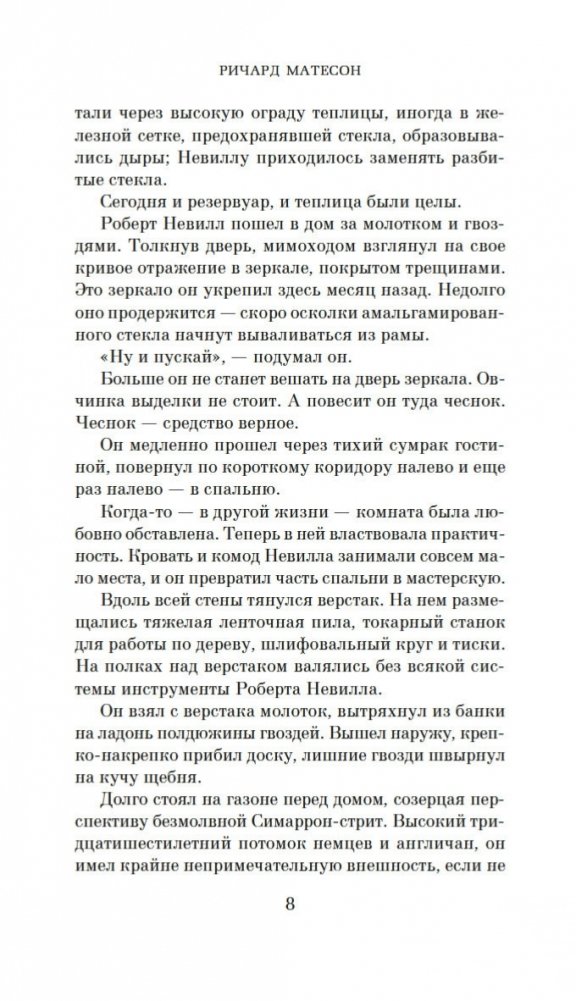 «Я — легенда» Ричарда Матесона — книга поистине легендарная, как легендарно имя ее создателя. Роман породил целое направление в литературе, из него выросли такие мощные фигуры современного литературного мира, как Рэй Брэдбери, Стивен Кинг… — двух этих имен достаточно для оценки силы влияния. Лучшие режиссеры планеты — Стивен Спилберг, Роджер Корман и другие — поставили фильмы по произведениям Матесона. Второй роман, вошедший в эту книгу, «Невероятный уменьшающийся человек», не менее знаменит, чем первый. Человек — песчинка перед темной мощью природы, но и эта малая молекула жизни всеми силами должна защищать себя, чтобы доказать и себе, и миру свое право на земное существование.