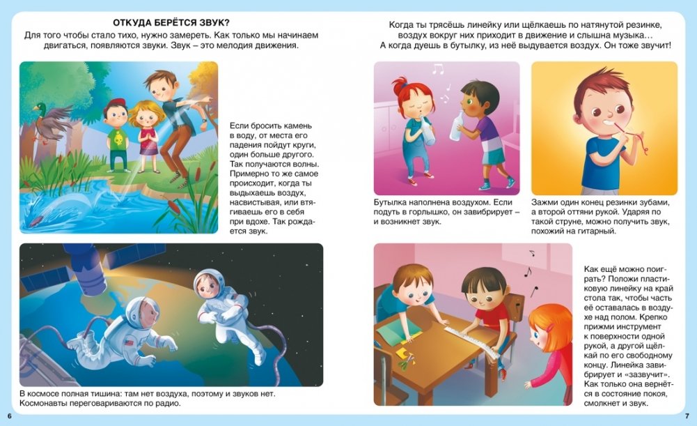Ты поймёшь, почему мы слышим звуки и благодаря чему можем говорить и петь, потренируешься управлять своим голосом, изучишь основы нотной грамоты, узнаешь, что представляют из себя музыкальные направления, познакомишься с различными видами инструментов и… даже сможешь изготовить свой! А ещё тебя ждут любопытные опыты со звуком и занимательные игры и задания, которые помогут проверить полученные знания.