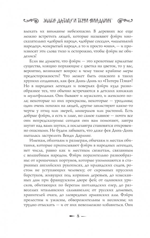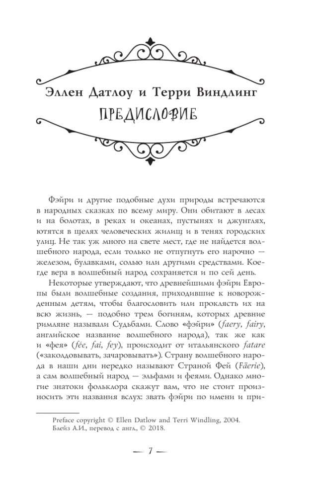 Фэйри или подобных им существ можно встретить почти во всех культурах мира. Доброжелательные и ужасающие, обаятельные и возмутительные, они меняют форму от страны к стране, от истории к истории и от момента к моменту, не меняя своей сути. Прославленные составители антологий Эллен Датлоу и Терри Виндлинг собрали под одной обложкой лучших творцов фантастических рассказов и стихов, которые в своем творчестве опираются на величайшее богатство мировых знаний о фэйри и классических произведений о них: Нила Геймана, Холли Блэк, Чарльза Де Линта, Патрицию Маккиллип, Танит Ли и многих других.