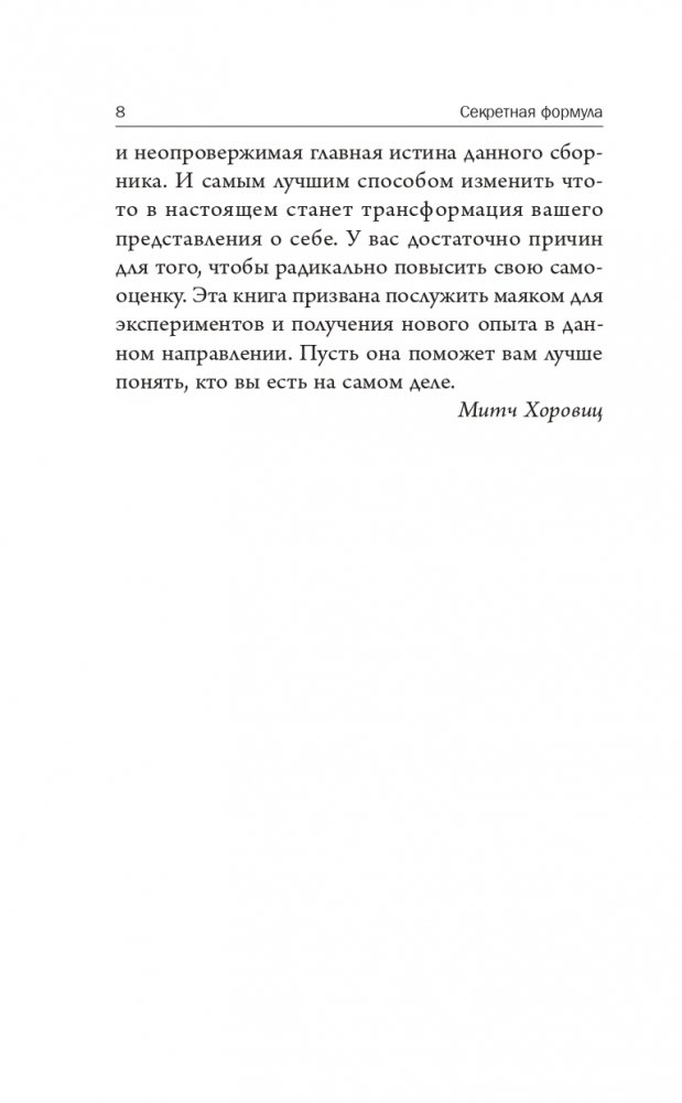 С этих избранных лекций Джозефа Мэрфи начинается серия книг под редакцией его известного последователя Митча Хоровица. В сборник включены краткая биография и хронология жизни незабвенного учителя. Как подчеркивает в предисловии составитель сборника, «ваш подсознательный разум в значительной степени формирует вашу судьбу — вот почему вы можете изменить ее сами». Для этого нужно лишь воспользоваться надежными и проверенными методами, которые описываются в «Секретной формуле» доктора Мэрфи.