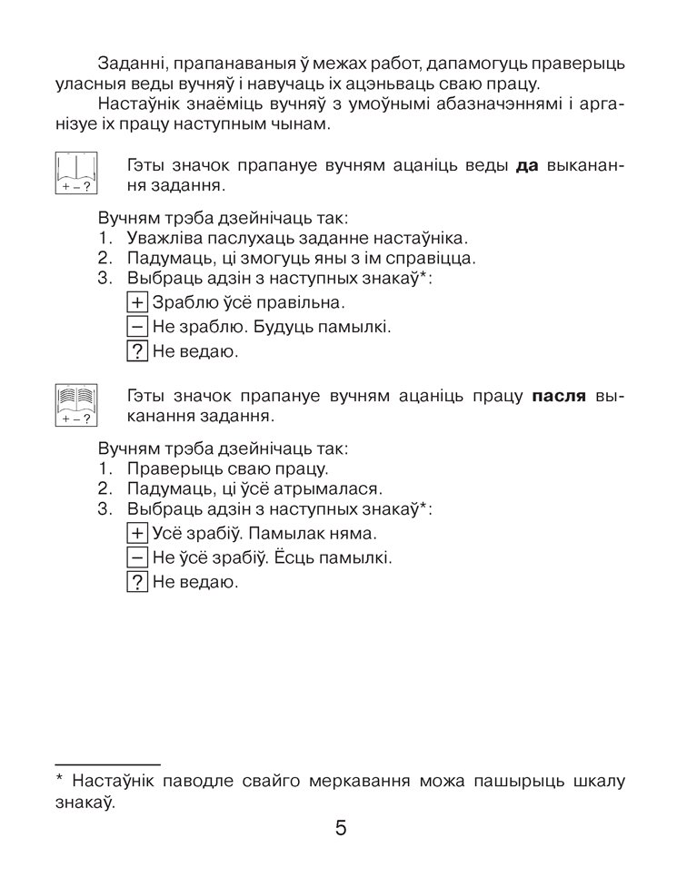 Дапаможнік змяшчае дыягнастычныя работы, тэматычныя праверачныя работы, тэксты для кантрольнага спісвання з лінейкамі для запісу, тэксты для праверкі навыку чытання. Да кожнай работы прыведзены кароткія метадычныя рэкамендацыі для настаўніка па выкананні заданняў, а таксама сістэма самаацэнкі для вучняў. Адрасуецца настаўнікам устаноў агульнай сярэдняй адукацыі з беларускай мовай навучання.