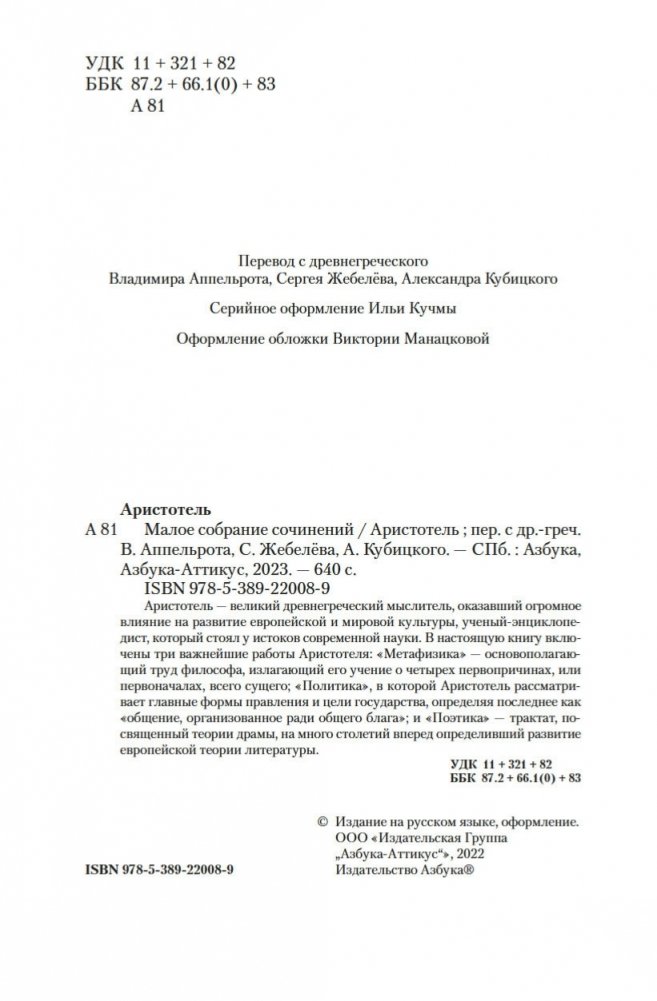 Аристотель — великий древнегреческий мыслитель, оказавший огромное влияние на развитие европейской и мировой культуры, ученый-энциклопедист, который стоял у истоков современной науки. В настоящую книгу включены три важнейшие работы Аристотеля: «Метафизика» — основополагающий труд философа, излагающий его учение о четырех первопричинах, или первоначалах, всего сущего; «Политика», в которой Аристотель рассматривает главные формы правления и цели государства, определяя последнее как «общение, организованное ради общего блага»; и «Поэтика» — трактат, посвященный теории драмы, на много столетий вперед определивший развитие европейской теории литературы.