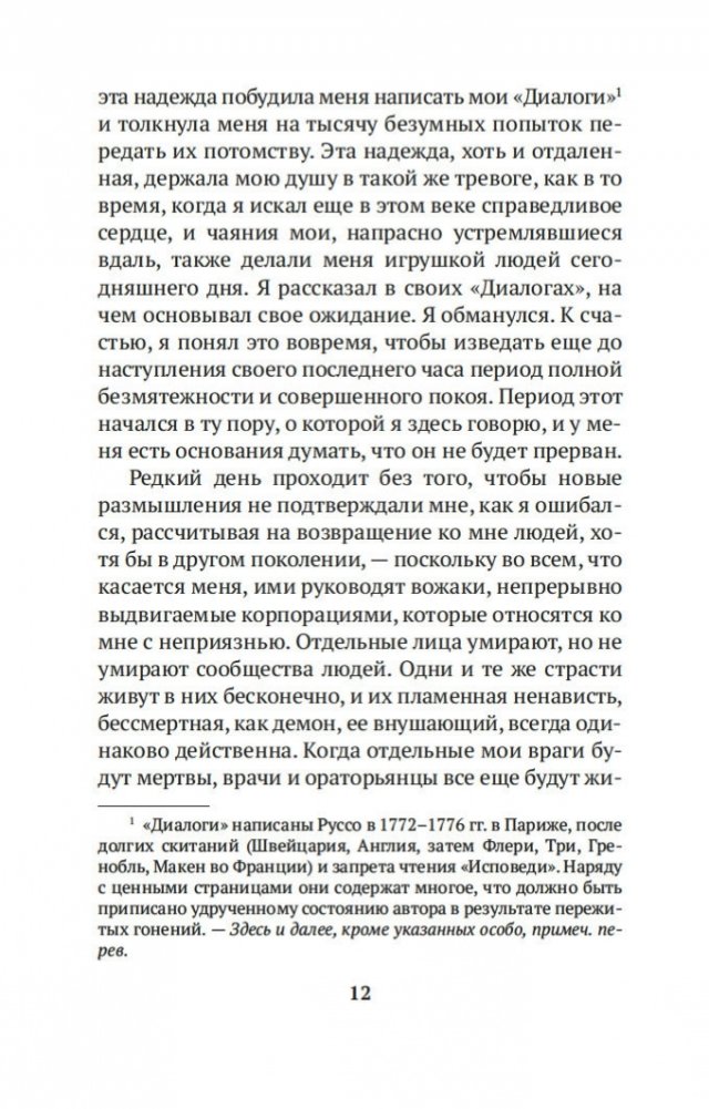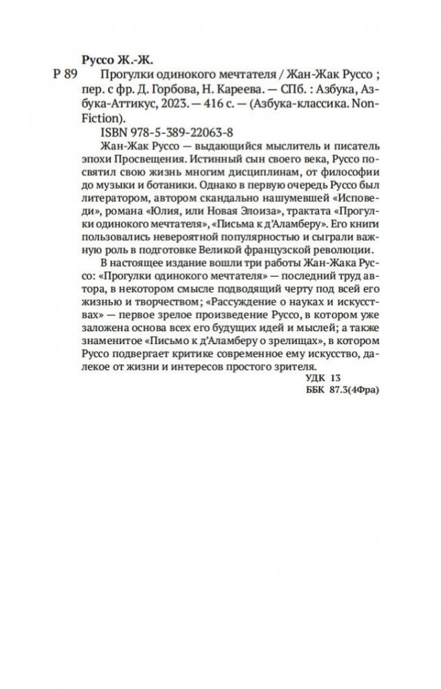 Жан-Жак Руссо — выдающийся мыслитель и писатель эпохи Просвещения. Истинный сын своего века, Руссо посвятил свою жизнь многим дисциплинам, от философии до музыки и ботаники. Однако в первую очередь Руссо был литератором, автором скандально нашумевшей «Исповеди», романа «Юлия, или Новая Элоиза», трактата «Прогулки одинокого мечтателя», «Письма к д’Аламберу». Его книги пользовались невероятной популярностью и сыграли важную роль в подготовке Великой французской революции. В настоящее издание вошли три работы Жан-Жака Руссо: «Прогулки одинокого мечтателя» — последний труд автора, в некотором смысле подводящий черту под всей его жизнью и творчеством; «Рассуждение о науках и искусствах» — первое зрелое произведение Руссо, в котором уже заложена основа всех его будущих идей и мыслей; а также знаменитое «Письмо к д’Аламберу о зрелищах», в котором Руссо подвергает критике современное ему искусство, далекое от жизни и интересов простого зрителя.