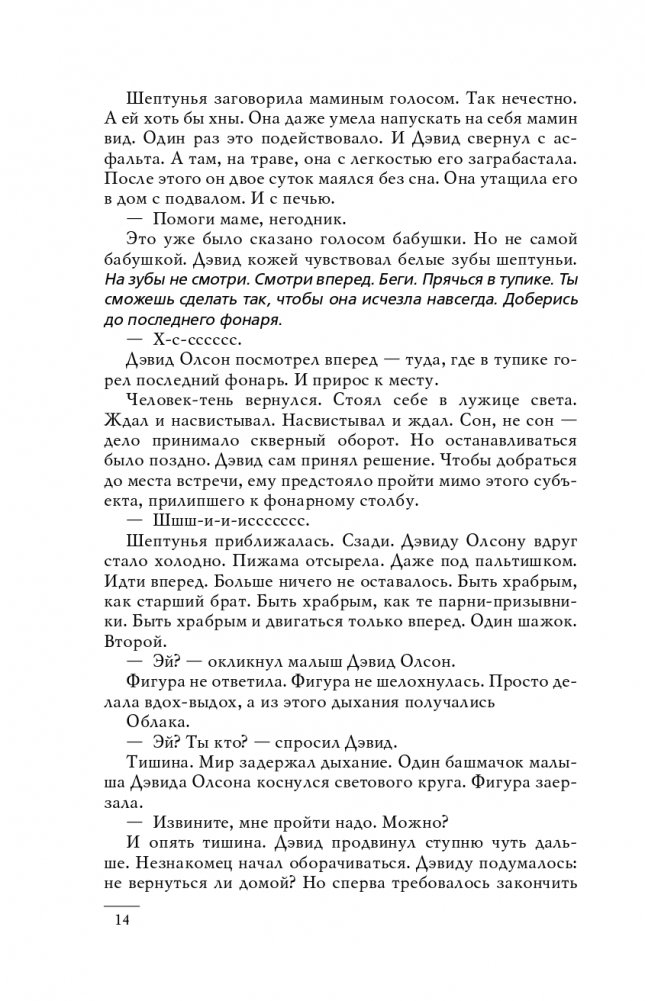 Кинематографичное повествование и напряженный сюжет для поклонников Стивена Кинга — о семье, дружбе, страхе, одиночестве, безумии, вере и спасении от автора, которого высоко ценят Эмма Уотсон, Джо Хилл, Джон Грин, Линкольн Чайлд и другие профессионалы литературы и киноиндустрии.