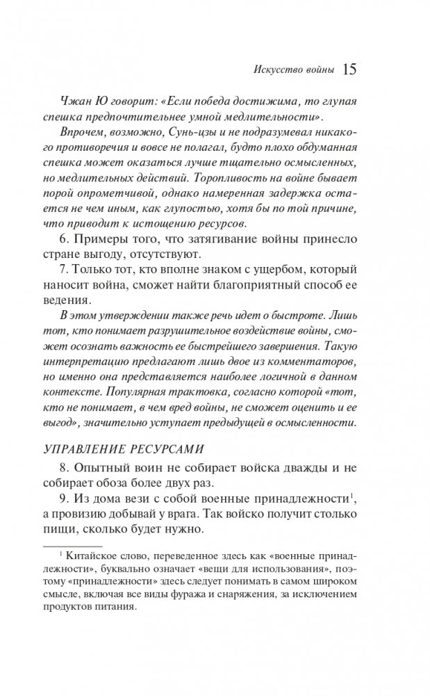 Но это только в узком чисто военном смысле. Борьба на войне не отличается по своей природе от борьбы вообще: это такая же борьба, как и всякая другая, ведущаяся не военными средствами.Сунь Цзы ставит ее в один ряд с борьбой дипломатической, с борьбой политической. Неудивительно, что в наши дни древнее «Искусство войны» привлекает не столько правителей и их генералов, сколько бизнесменов, успешно использующих положения «Искусства войны» для задач управления и разрешения конфликтов.