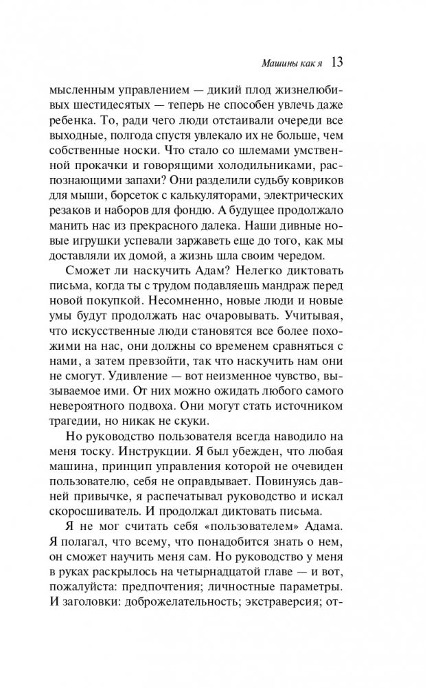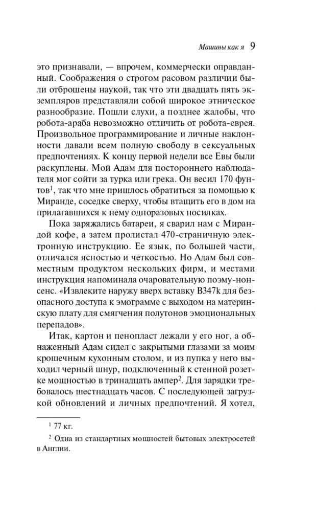 От автора современной британской прозы, знаменитого своими романами «Амстердам», «Искупление», «Невыносимая любовь» и многих других, лауреата Букеровской премии Йэна Макьюэна. Интеллектуальная проза во всех смыслах. На фоне политической ситуации в Англии, когда пришло время Маргарет Тэтчер покидать пост премьер-министра, а в науке Алан Тьюринг сделал прорыв в области создания искусственного интеллекта, развивается история главных героев.