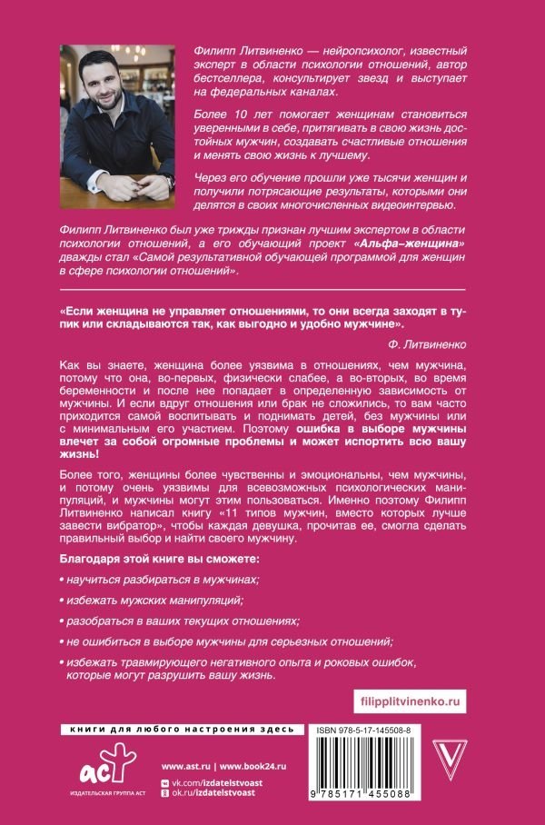Более того, женщины более чувственны и эмоциональны чем мужчины и поэтому очень уязвимы для всевозможных психологических манипуляций и мужчины могут этим пользоваться. Именно поэтому Филипп Литвиненко написал книгу "11 типов мужчин, вместо которых лучше завести вибратор", чтобы каждая девушка, прочитав ее, смогла сделать правильный выбор и найти своего мужчину.