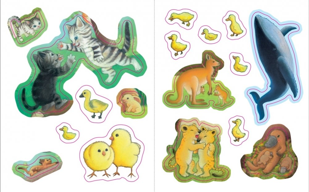 В воде и на суше обитает множество разных животных и их детёнышей. Посмотри, как они выглядят и называются, и узнай, кто из них живёт на заливном лугу, на ферме, в жаркой саванне, среди снега и льда и в океане. Найди место для каждого малыша, используя яркие наклейки!