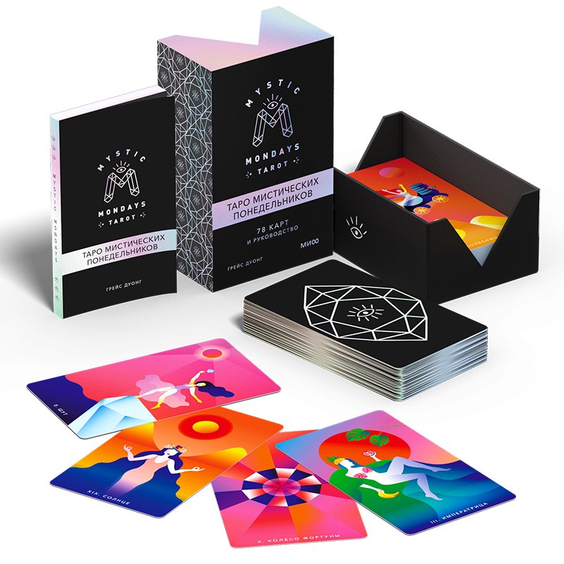 Колода Mystic Mondays Tarot была создана Грейс Дуонг, мультидисциплинарным художником и дизайнером, и включает 78 карт и 160-страничное полноцветное руководство, предлагающее свежие интерпретации Старших и Младших арканов.