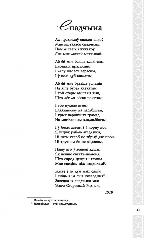 У кнігу ўвайшлі творы народных паэтаў Беларусі Янкі Купалы («Спадчына», «Курган») і Якуба Коласа («Новая зямля»).