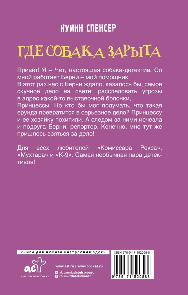 Привет! Я — Чет, настоящая собака-детектив. Со мной работает Берни —мой помощник. В этот раз нас с Берни ждало, казалось бы, самое скучное дело на свете: расследовать угрозы в адрес какой-то выставочной болонки, Принцессы. Но кто бы мог подумать, что такая ерунда превратится в серьезное дело? Принцессу и ее хозяйку похитили. А следом за ними исчезла и подруга Берни, репортер. Конечно, мне тут же пришлось взяться за дело!