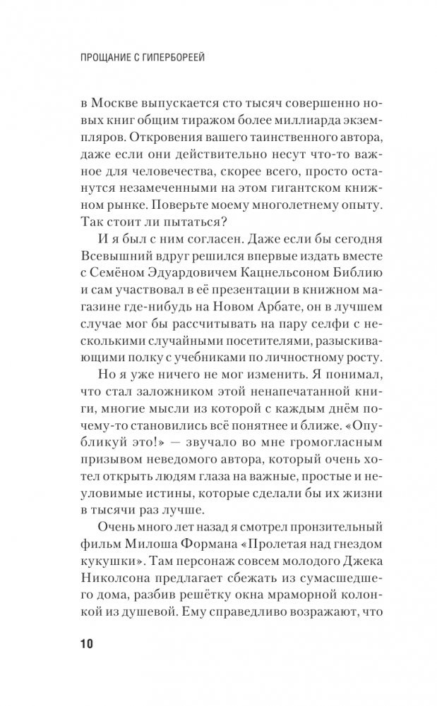 Боги древних цивилизаций, демоны и ангелы по сей день вмешиваются в жизнь людей. Иначе порой не объяснить весь абсурд происходящего, все опасности и ужасы, войны, эпидемии и катастрофы. Боги просто ставят эксперименты над человечеством, питаясь нашими эмоциями — вернее, особым веществом, которое вырабатывается в воздухе, когда мы любим или злимся, страдаем или защищаем свою честь. Обнажение тайных пружин и механизмов человеческой жизни — на фоне самых острых современных событий — и необычная история любви двух жителей огромного мегаполиса. Об этом роман Владимира Торина "Прощание с Гипербореей".