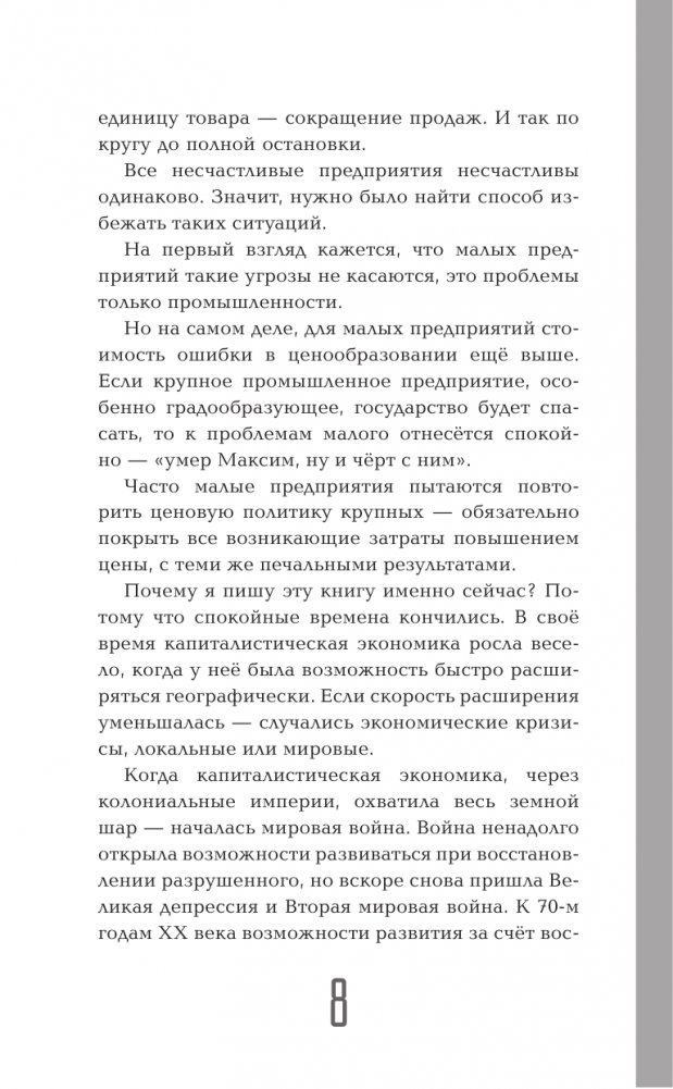 Из книги Дмитрия Окладникова вы узнаете, какие есть методы назначения цены и какие у них недостатки, как находить оптимальную цену и как на неё влияет срок годности и прочие ограничения, нужно ли бояться демпинга и что такое ценовая дискриминация, как использовать знания в этой сфере, чтобы выжить в кризис и не обанкротиться. И все это – в простой и понятной форме, с графиками в виде комиксов и небольшими шарадами.