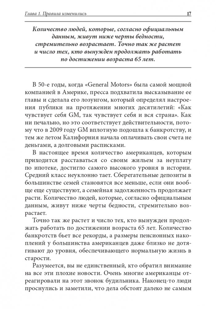 Жалобы, нытье и обвинения не обеспечат вам будущего. Если вы стремитесь к богатой жизни, то должны построить ее сами. Но вы сможете взять на себя ответственность за свое будущее лишь в том случае, если научитесь контролировать источники доходов. Для этого вам нужен собственный бизнес. Хоть для большей части населения наступили тяжелые времена, но истинные предприниматели уверены, что такие периоды способствуют полному раскрытию нашего экономического потенциала. Начинать собственный бизнес в нынешней обстановке не только можно, но и нужно. Лучшего времени для этого вы не найдете!