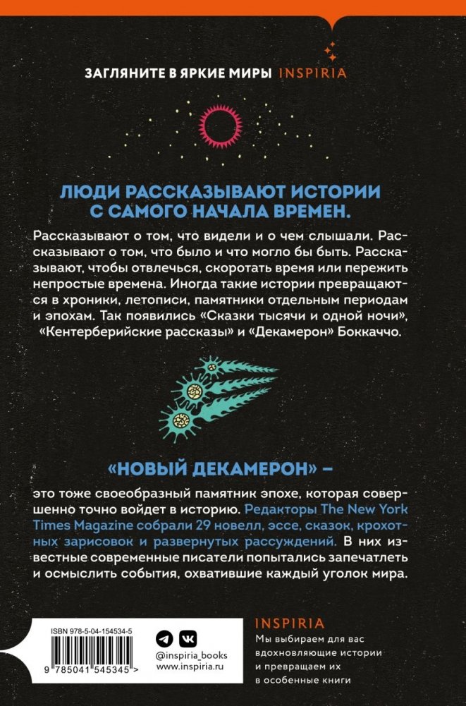 «Новый Декамерон» — это тоже своеобразный памятник эпохе, которая совершенно точно войдет в историю. Редакторы The New York Times Magazine собрали 29 новелл, эссе, сказок, крохотных зарисовок и развернутых рассуждений. В них самые известные современные писатели попытались запечатлеть и осмыслить события, охватившие каждый уголок мира.