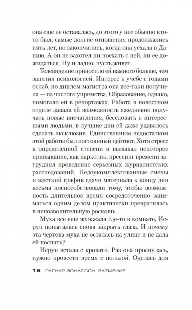 В глухом месте на севере Исландии обнаружено изуродованное тело. Офицер полиции Ари Тор, которому поручено расследование, пытается собрать всю информацию о жертве преступления, чтобы понять причины трагедии. Однако личность убитого интересует не только полицейского. Параллельное расследование ведет также журналистка из Рейкьявика, и движет ею не только желание написать сенсационный репортаж. В то же время в заброшенной деревеньке недалеко от места преступления томится взаперти, ожидая смерти, непальская девушка… Загадок становится все больше, прошлое играет с настоящим, напряжение нарастает, а сюжетные линии сплетаются в тугой клубок. «Затмение» — вторая книга в серии об Ари Торе, молодом детективе, который, оставив в Рейкьявике дом и возлюбленную, прибыл на службу в полиции в небольшой городок на севере страны, отрезанный от остального мира суровой природой. Книга вышла сразу вслед за «Снежной слепотой» и имела большой успех у читателей, как и другие книги Рагнара Йонассона, «короля скандинавского нуара», удостоенного престижных литературных наград и признанного одним из лучших современных писателей, работающих в жанре детектива. Впервые на русском языке!