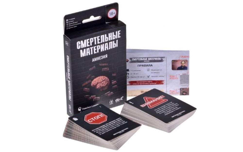 Настольная игра "Смертельные материалы: Амнезия" – это карточный детективный квест в лучших традициях жанра Escape Room (побег из комнаты). В начале игры 5 человек оказываются запертыми в необычной комнате: на их шеях ошейники, бьющие током, а память стёрта – они не помнят ничего ни о себе, ни друг о друге. Вам предстоит взять под управление всех героев сразу; вы будете решать логические загадки и головоломки, чтобы помочь "забывшимся" пройти все комнаты с испытаниями. Сможете сохранить жизнь им всем?