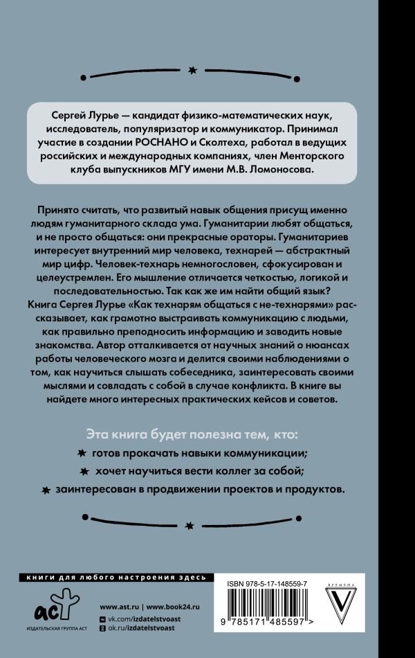 Книга Сергея Лурье "Как технарям общаться с не-технарями" рассказывает, как грамотно выстраивать коммуникацию с людьми, как правильно преподносить информацию и заводить новые знакомства. Автор отталкивается от научных знаний о нюансах работы человеческого мозга и делится своими наблюдениями о том, как научиться слышать собеседника, заинтересовать своими мыслями и совладать с собой в случае конфликта. В книге вы найдете много интересных практических кейсов и советов.