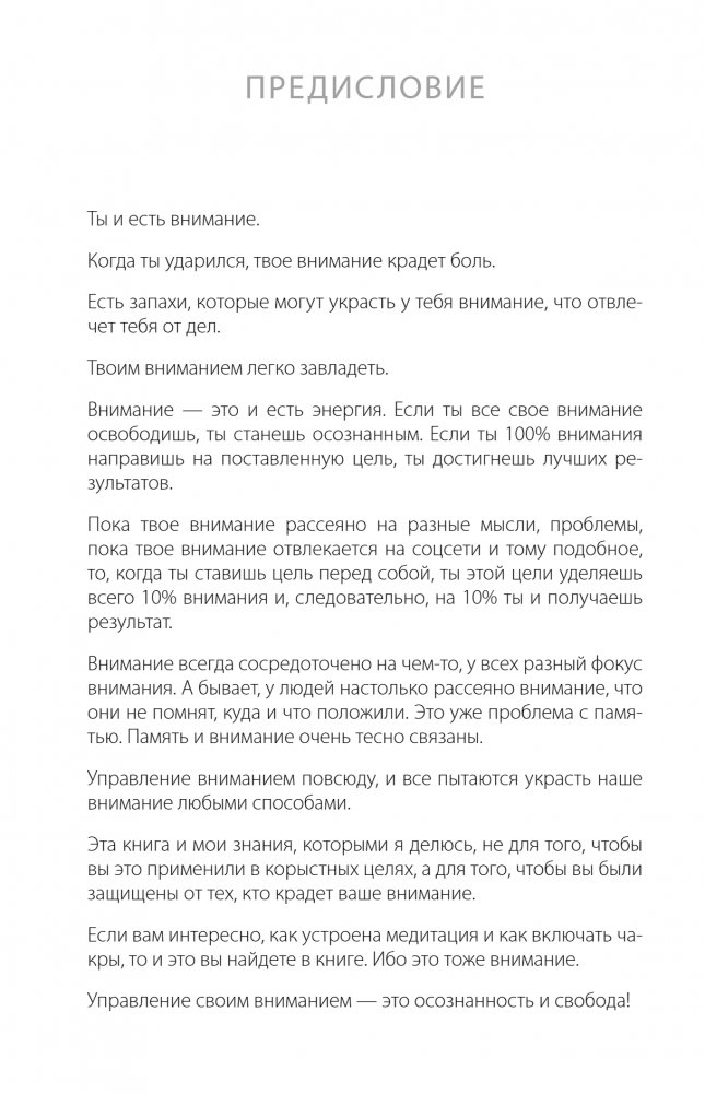 В этой книге автор описал примеры, в которых можно ясно увидеть, что все в нашей жизни построено на внимании. Благодаря вниманию люди влюбляются, болеют и выздоравливают. Внимание используется во всем. От вашего внимания зависит ваша жизнь. Ведь внимание — это и есть Вы