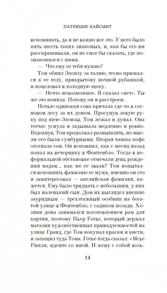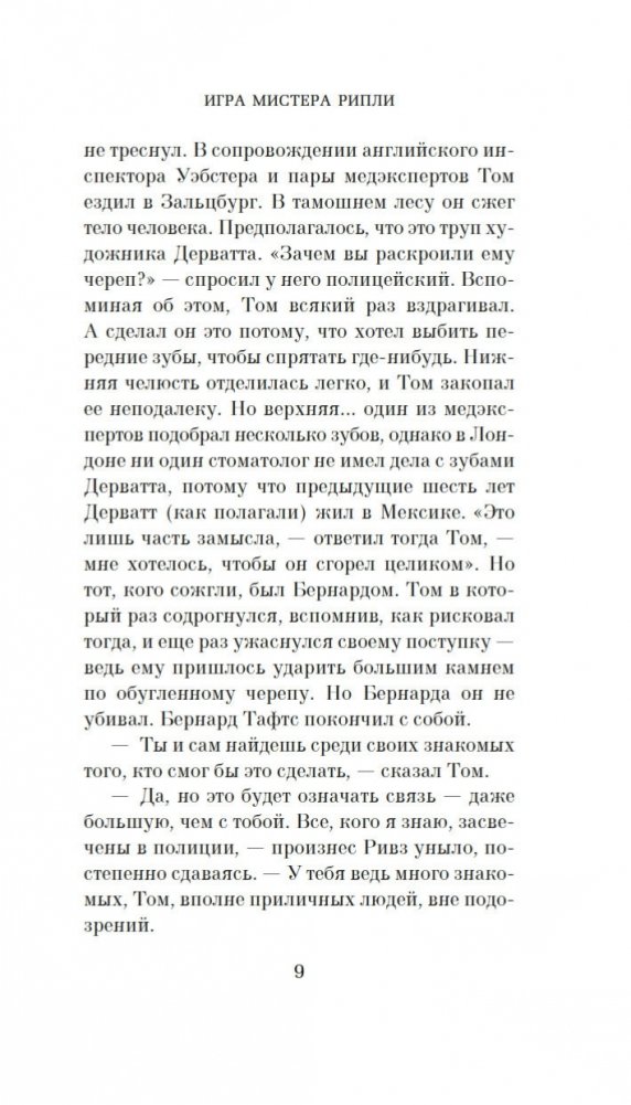 «Игра мистера Рипли» (1974) — третья книга в серии о самом известном персонаже американской романистки. Убийца «лишь по необходимости», гурман и эстет, любезный и вполне добродушный Рипли совсем не похож на банального костолома. Он обитает в мире, где вымысел и реальность неотличимы, границы между добром и злом весьма условны, а преступление — это игра, шахматная партия, невинное развлечение между игрой на клавесине и занятиями в саду; своего рода головоломка, только «головы» на кону всегда настоящие. Как и другие книги «риплиады», «Игра мистера Рипли» имела успех у читателей и была переведена на многие языки; по мотивам романа в 1977 году Вим Вендерсон снял фильм «Американский друг», в котором роль Рипли исполнил Деннис Хоппер, а в 2002 году вышел новый одноименный фильм с Джоном Малковичем в главной роли.