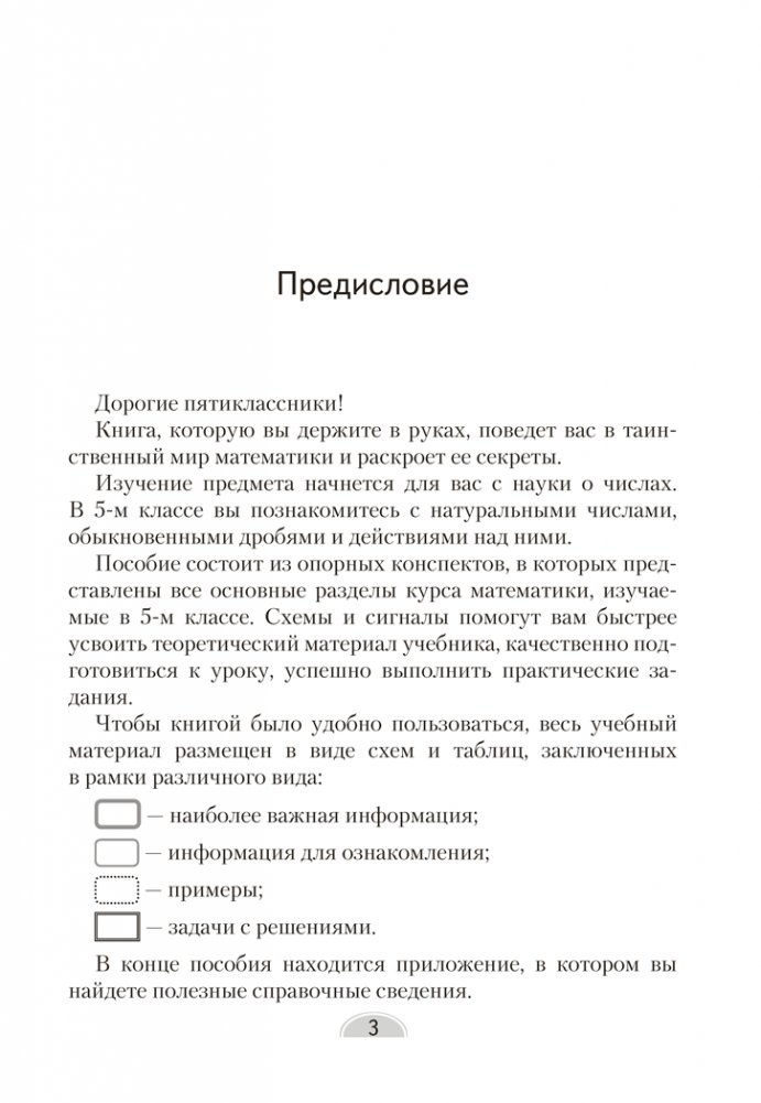 В пособии в форме опорных конспектов наглядно представлен учебный материал курса математики 5 класса. Использование опорных конспектов позволит учащимся сконцентрировать внимание на наиболее трудных для запоминания местах, многократно повторить изученное, а учителям — провести оперативный контроль усвоения материала, привлечь к проверке знаний родителей.
