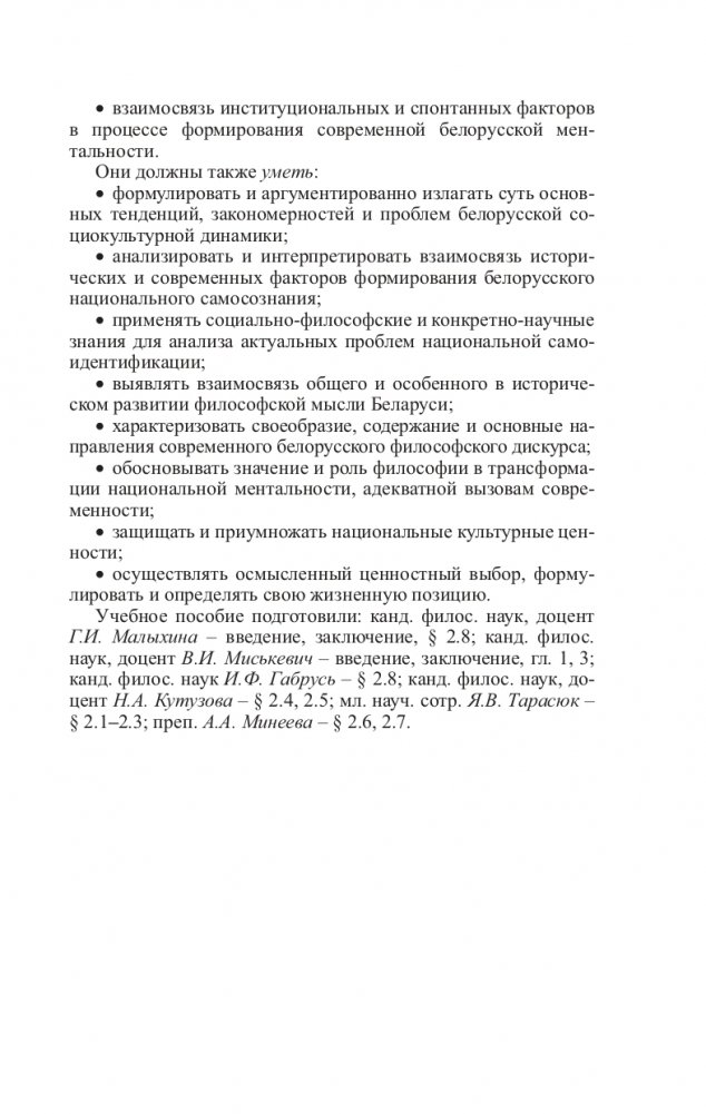 Рассматриваются основные этапы развития белорусской философской мысли, анализируются ее особенности в различные исторические эпохи, очерчиваются задачи и перспективы современной отечественной философии в развитии национального самосознания и формировании гражданско-патриотического мировоззрения молодого поколения. Через персоналии выдающихся мыслителей и деятелей культуры реконструируются гуманистическая и интеллектуальная традиции философии Беларуси. Практическая значимость философии как неотъемлемого компонента национальной культуры рассматривается в контексте синергийных процессов социокультурной динамики современного белорусского общества.