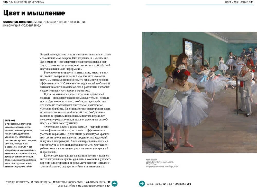 В книге четыре раздела: «Цвет в истории и искусстве», «Цвет в мифологии и культуре», «Цветовая символика» и «Влияние цвета на человека». Каждый можно читать отдельно или вместе с другими. Полезные ссылки внизу каждой страницы ведут читателя от одного раздела к другому, а во врезках рассказывается о ключевых событиях в истории цвета.