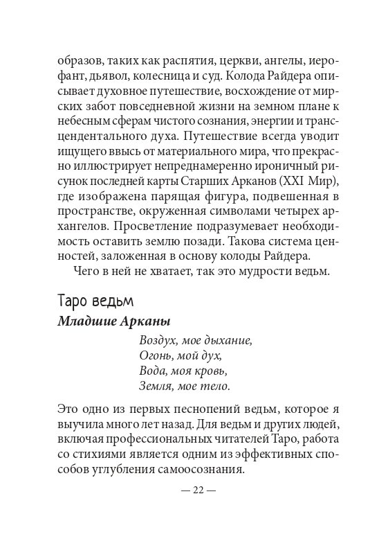 Младшие Арканы в этой колоде характеризуют роль стихий Воздуха, Огня, Воды и Земли в повседневной жизни. Воодушевляющие послания карт призывают вас использовать необузданную божественную магию природы, следуя мудрым посланиям матери-земли и ее детей. Старшие Арканы — это карты судьбы, которые описывают путешествие души в направлении, противоположном традиционному. Чтобы достичь просветления, вовсе не обязательно оставлять позади все заботы материального мира. С точки зрения ведьм, для этого нужно лишь проникнуть вглубь матери-земли и своей истинной сущности, где воплощается божественная энергия.