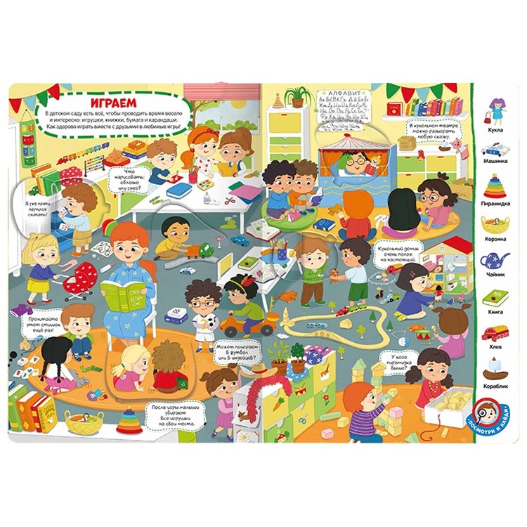 Виммельбух - это большая красочная книга, на каждой странице которой происходит множество событий и умещается множестов героев. А виммельбух с окошками "Детский сад" от Malamalama - это веселые приключения в детском саду, множество забавных и трогательных ситуаций, добрые и милые персонажи, а также десяки сюрпризов в окошках. Отправляйтесь в путешествие вместе с малышом по страницам виммельбуха "Детский сад"!