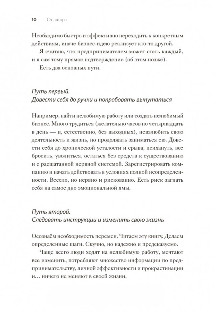 Это руководство к действию, пошаговая инструкция по основным этапам создания собственного дела. С ней вы будете готовы к запуску/перезапуску своего бизнеса (с высокой вероятностью — уже в процессе чтения). Чтобы изучить все материалы, заполнить все рабочие таблицы, выполнить все задания и запустить свой бизнес по моей методике, в среднем нужно всего 72 часа. Если не спать и не есть, то это трое суток, но я рекомендую придерживаться принципа "Одна неделя — одна глава". Итого девять недель.