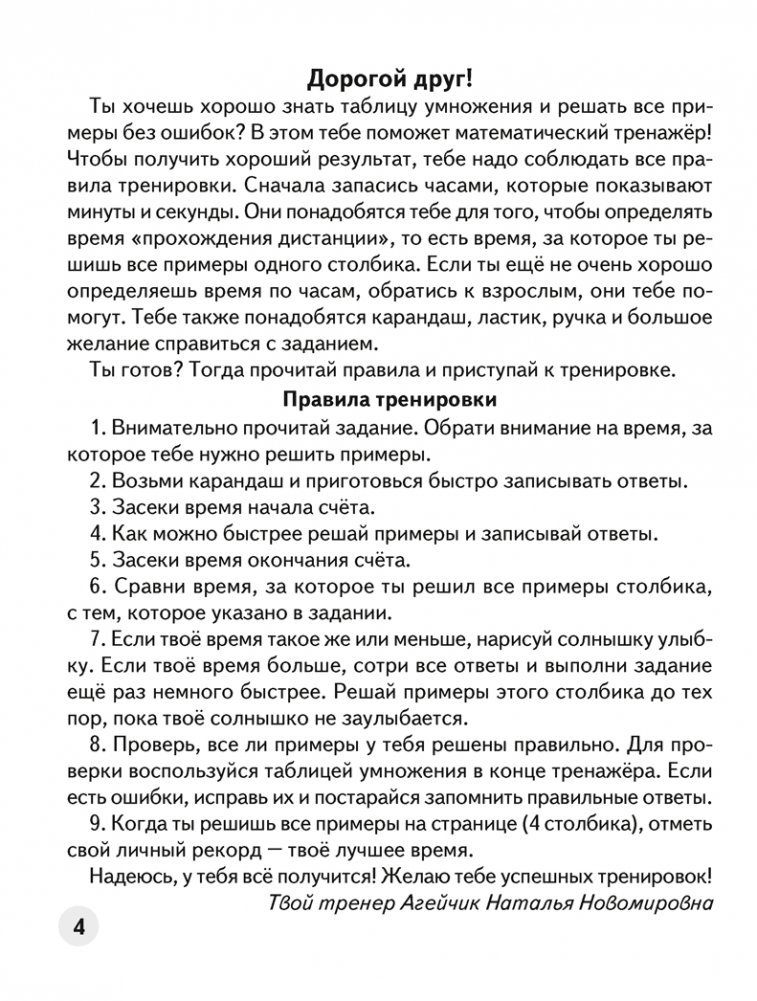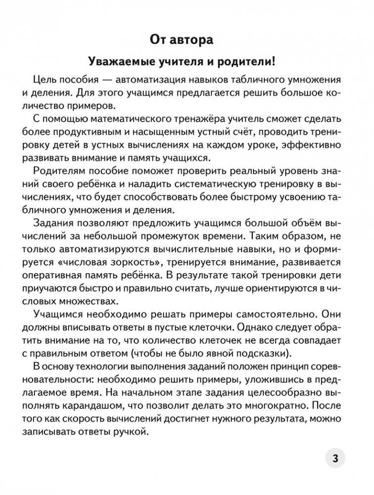 Пособие предназначено для автоматизации навыков табличного умножения и деления. При выполнении заданий не только отрабатываются вычислительные навыки, но и формируется «числовая зоркость», тренируется внимание, развивается оперативная память ребёнка. Тренажёр можно использовать для работы как в классе, так и дома.